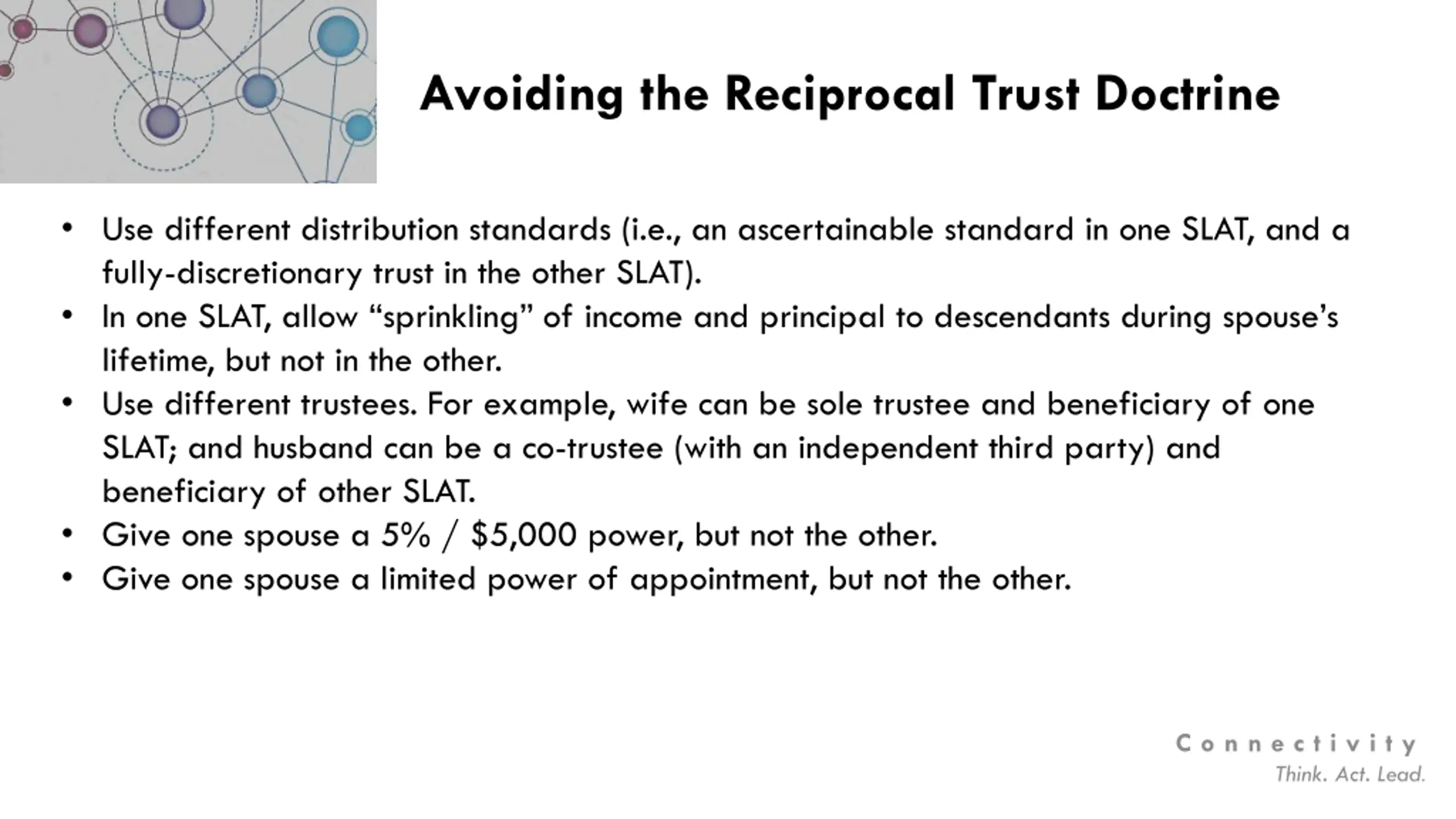 Avoiding the Reciprocal Trust Doctrine Use different distribution standards (i.e., an ascertainable standard in one SLAT, and a fully-discretionary trust in the other SLAT). In one SLAT, allow sprinkling of income and principal to descendants during spouse s lifetime, but not in the other. Use different trustees. For example, wife can be sole trustee and beneficiary of one SLAT; and husband can be a co-trustee (with an independent third party) and beneficiary of other SLAT. Give one spouse a 5% / $5,000 power, but not the other. Give one spouse a limited power of appointment, but not the other. C o n n e c t i v i t y Think. Act. Lead.