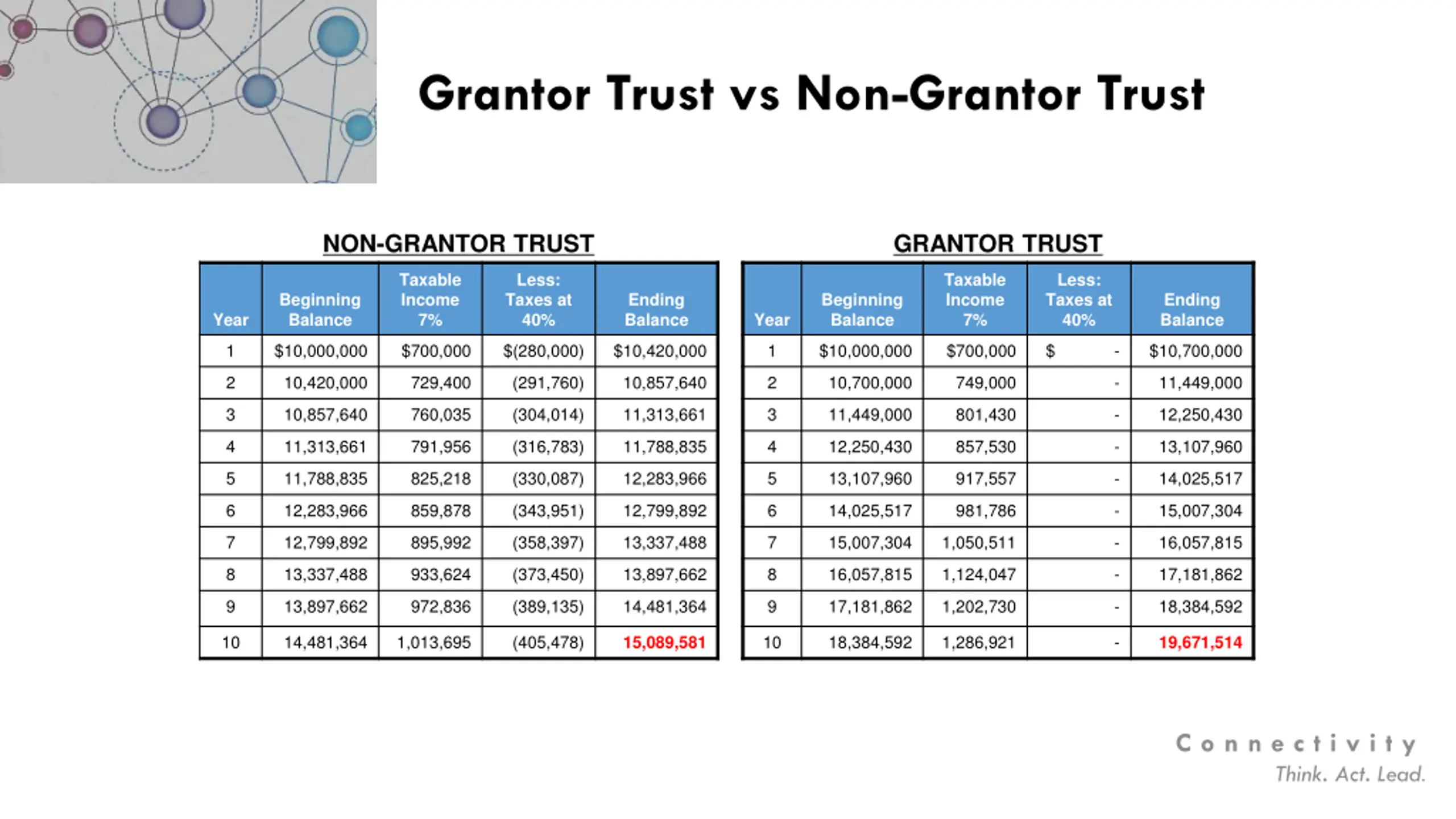 Grantor Trust vs Non-Grantor Trust NON-GRANTOR TRUST GRANTOR TRUST Taxable Income 7% Less: Taxes at 40% Taxable Income 7% Less: Taxes at 40% Beginning Balance Ending Balance Beginning Balance Ending Balance Year Year 1 $10,000,000 $700,000 $(280,000) $10,420,000 1 $10,000,000 $700,000 $ - $10,700,000 2 10,420,000 729,400 (291,760) 10,857,640 2 10,700,000 749,000 - 11,449,000 3 10,857,640 760,035 (304,014) 11,313,661 3 11,449,000 801,430 - 12,250,430 4 11,313,661 791,956 (316,783) 11,788,835 4 12,250,430 857,530 - 13,107,960 5 11,788,835 825,218 (330,087) 12,283,966 5 13,107,960 917,557 - 14,025,517 6 12,283,966 859,878 (343,951) 12,799,892 6 14,025,517 981,786 - 15,007,304 7 12,799,892 895,992 (358,397) 13,337,488 7 15,007,304 1,050,511 - 16,057,815 8 13,337,488 933,624 (373,450) 13,897,662 8 16,057,815 1,124,047 - 17,181,862 9 13,897,662 972,836 (389,135) 14,481,364 9 17,181,862 1,202,730 - 18,384,592 10 14,481,364 1,013,695 (405,478) 10 18,384,592 1,286,921 - 15,089,581 19,671,514 C o n n e c t i v i t y Think. Act. Lead.