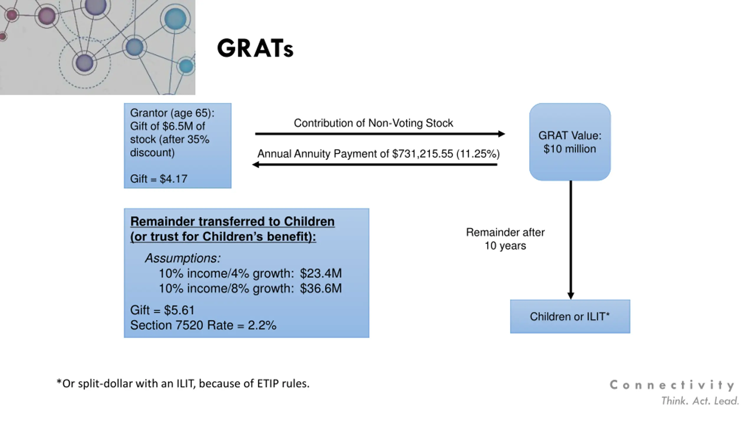 GRATs Grantor (age 65): Gift of $6.5M of stock (after 35% discount) Contribution of Non-Voting Stock GRAT Value: $10 million Annual Annuity Payment of $731,215.55 (11.25%) Gift = $4.17 Remainder transferred to Children (or trust for Children s benefit): Remainder after 10 years Assumptions: 10% income/4% growth: $23.4M 10% income/8% growth: $36.6M Gift = $5.61 Section 7520 Rate = 2.2% Children or ILIT* C o n n e c t i v i t y Think. Act. Lead. *Or split-dollar with an ILIT, because of ETIP rules.