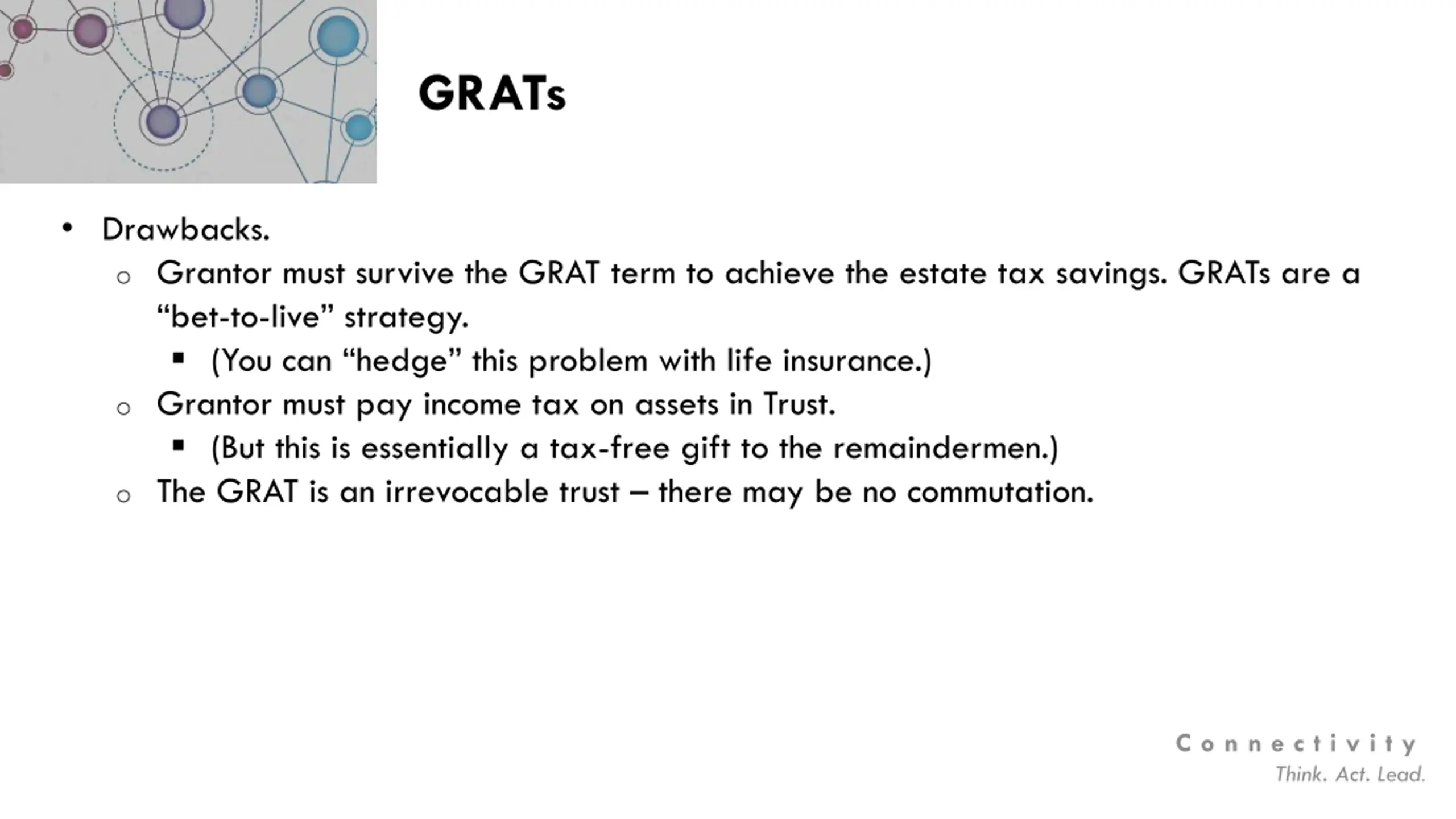 GRATs Drawbacks. o Grantor must survive the GRAT term to achieve the estate tax savings. GRATs are a bet-to-live strategy. (You can hedge this problem with life insurance.) o Grantor must pay income tax on assets in Trust. (But this is essentially a tax-free gift to the remaindermen.) o The GRAT is an irrevocable trust there may be no commutation. C o n n e c t i v i t y Think. Act. Lead.