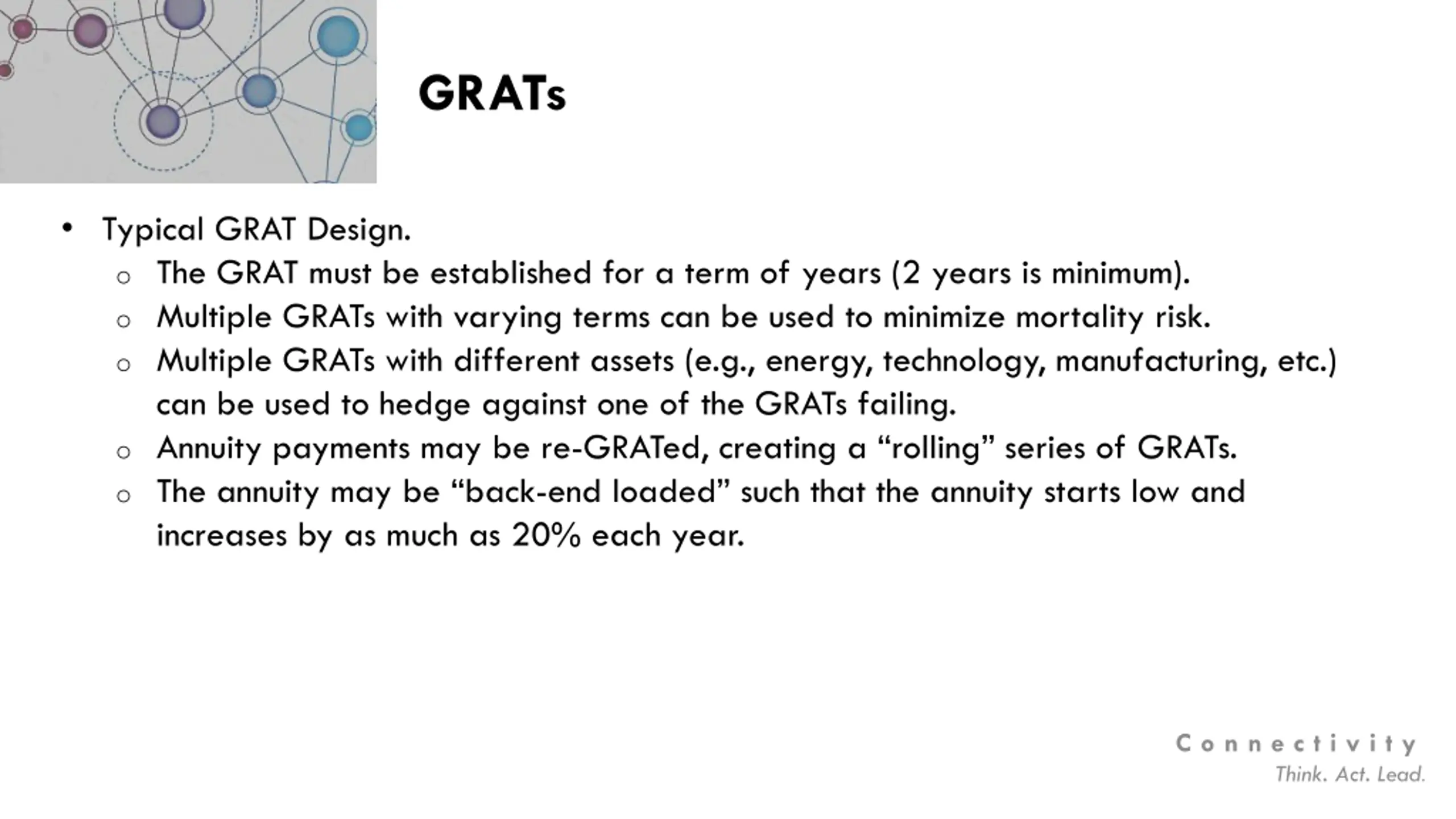 GRATs Typical GRAT Design. o The GRAT must be established for a term of years (2 years is minimum). o Multiple GRATs with varying terms can be used to minimize mortality risk. o Multiple GRATs with different assets (e.g., energy, technology, manufacturing, etc.) can be used to hedge against one of the GRATs failing. o Annuity payments may be re-GRATed, creating a rolling series of GRATs. o The annuity may be back-end loaded such that the annuity starts low and increases by as much as 20% each year. C o n n e c t i v i t y Think. Act. Lead.