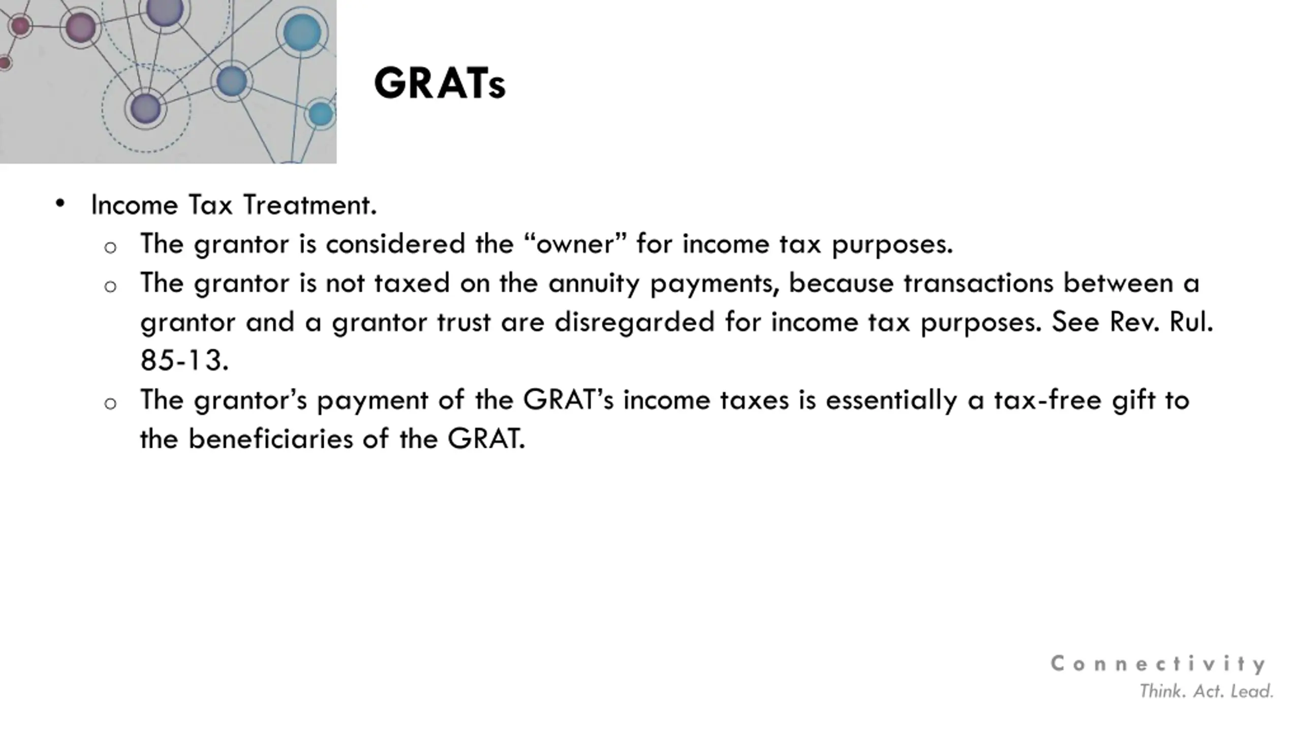 GRATs Income Tax Treatment. o The grantor is considered the owner for income tax purposes. o The grantor is not taxed on the annuity payments, because transactions between a grantor and a grantor trust are disregarded for income tax purposes. See Rev. Rul. 85-13. o The grantor s payment of the GRAT s income taxes is essentially a tax-free gift to the beneficiaries of the GRAT. C o n n e c t i v i t y Think. Act. Lead.