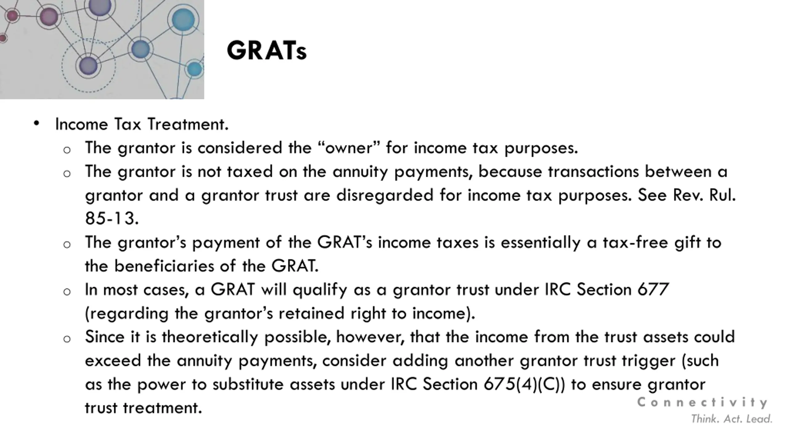 GRATs Income Tax Treatment. o The grantor is considered the owner for income tax purposes. o The grantor is not taxed on the annuity payments, because transactions between a grantor and a grantor trust are disregarded for income tax purposes. See Rev. Rul. 85-13. o The grantor s payment of the GRAT s income taxes is essentially a tax-free gift to the beneficiaries of the GRAT. o In most cases, a GRAT will qualify as a grantor trust under IRC Section 677 (regarding the grantor s retained right to income). o Since it is theoretically possible, however, that the income from the trust assets could exceed the annuity payments, consider adding another grantor trust trigger (such as the power to substitute assets under IRC Section 675(4)(C)) to ensure grantor trust treatment. C o n n e c t i v i t y Think. Act. Lead.