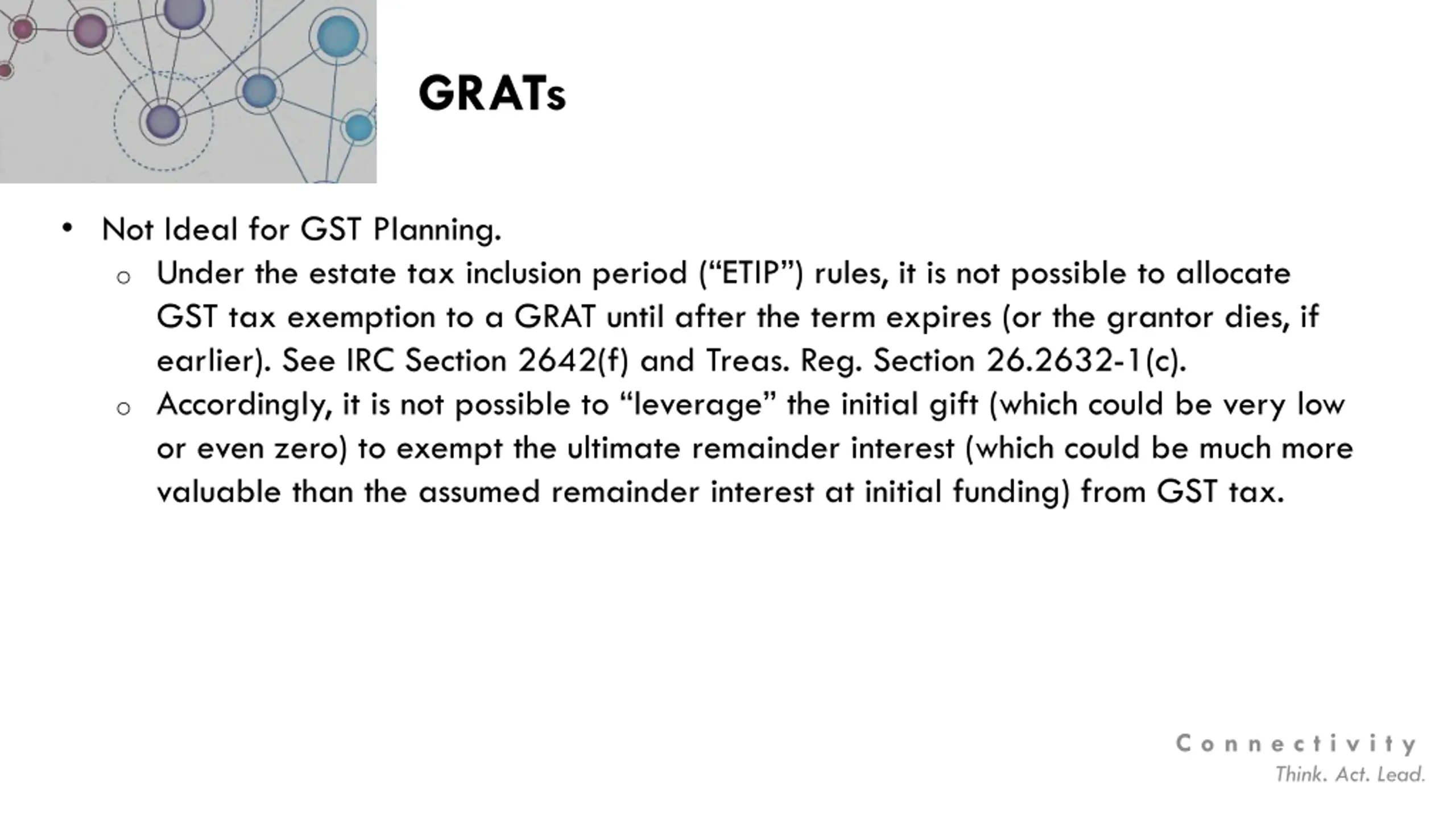 GRATs Not Ideal for GST Planning. o Under the estate tax inclusion period ( ETIP ) rules, it is not possible to allocate GST tax exemption to a GRAT until after the term expires (or the grantor dies, if earlier). See IRC Section 2642(f) and Treas. Reg. Section 26.2632-1(c). o Accordingly, it is not possible to leverage the initial gift (which could be very low or even zero) to exempt the ultimate remainder interest (which could be much more valuable than the assumed remainder interest at initial funding) from GST tax. C o n n e c t i v i t y Think. Act. Lead.