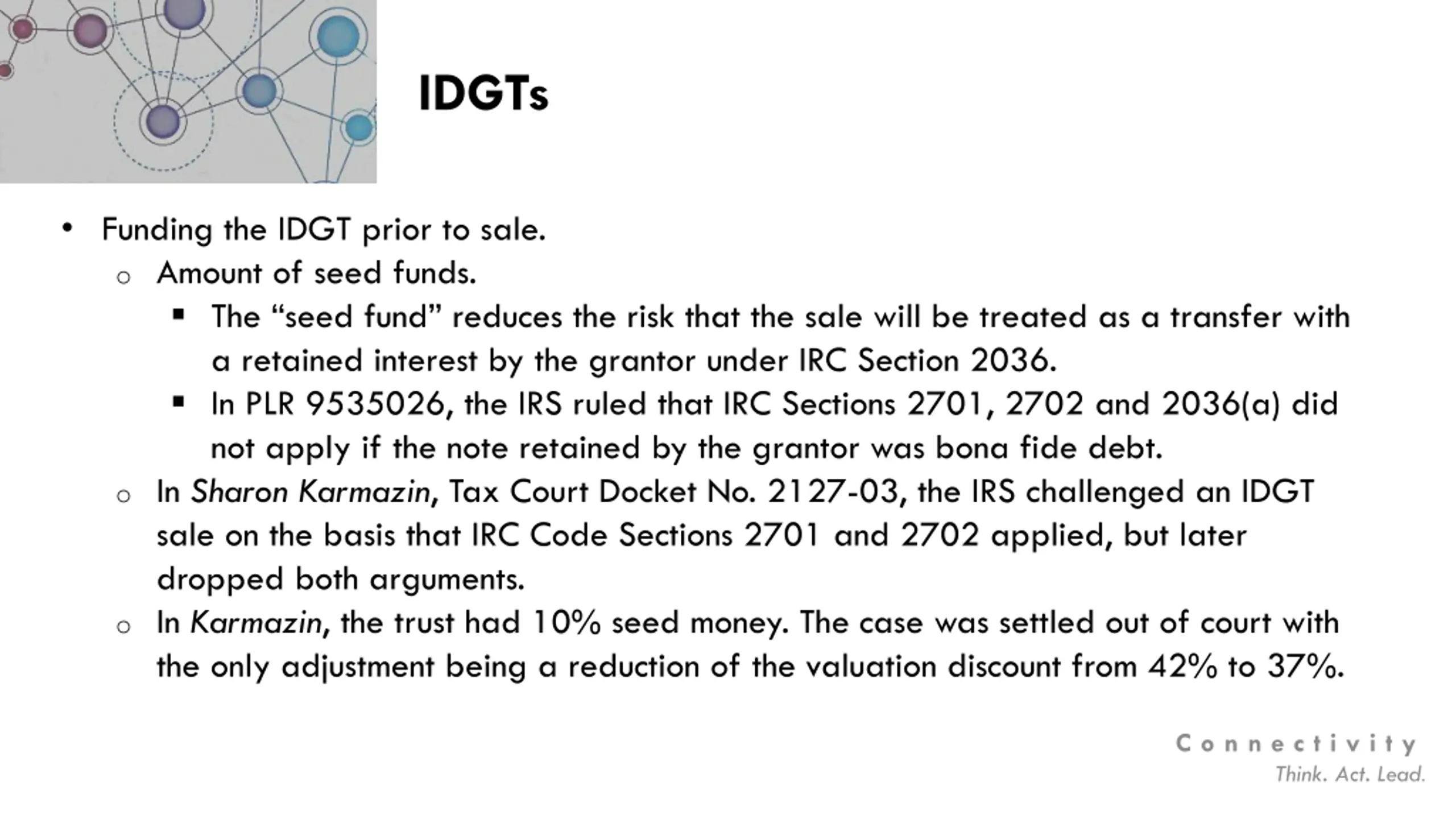 IDGTs Funding the IDGT prior to sale. o Amount of seed funds. The seed fund reduces the risk that the sale will be treated as a transfer with a retained interest by the grantor under IRC Section 2036. In PLR 9535026, the IRS ruled that IRC Sections 2701, 2702 and 2036(a) did not apply if the note retained by the grantor was bona fide debt. o In Sharon Karmazin, Tax Court Docket No. 2127-03, the IRS challenged an IDGT sale on the basis that IRC Code Sections 2701 and 2702 applied, but later dropped both arguments. o In Karmazin, the trust had 10% seed money. The case was settled out of court with the only adjustment being a reduction of the valuation discount from 42% to 37%. C o n n e c t i v i t y Think. Act. Lead.