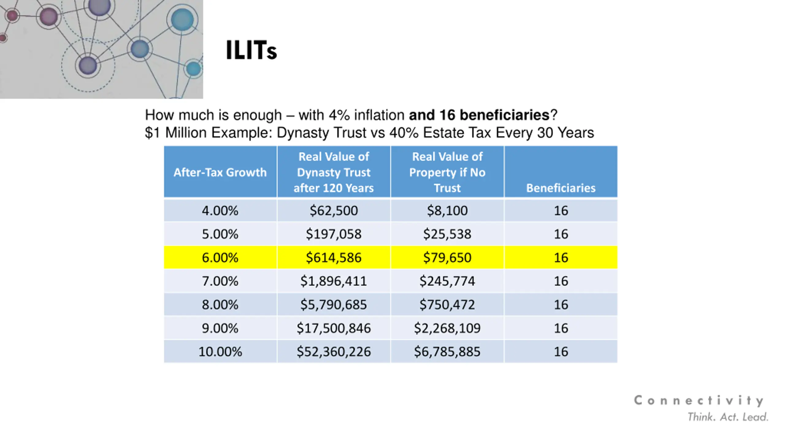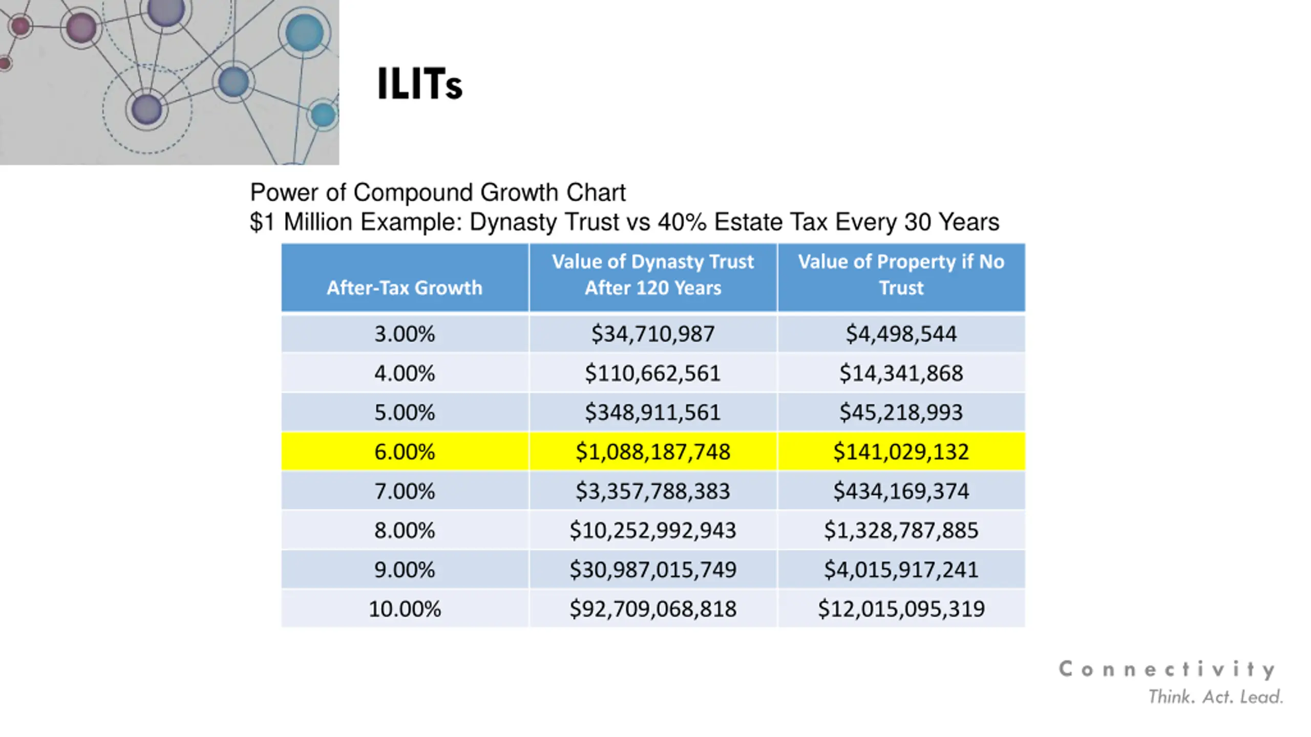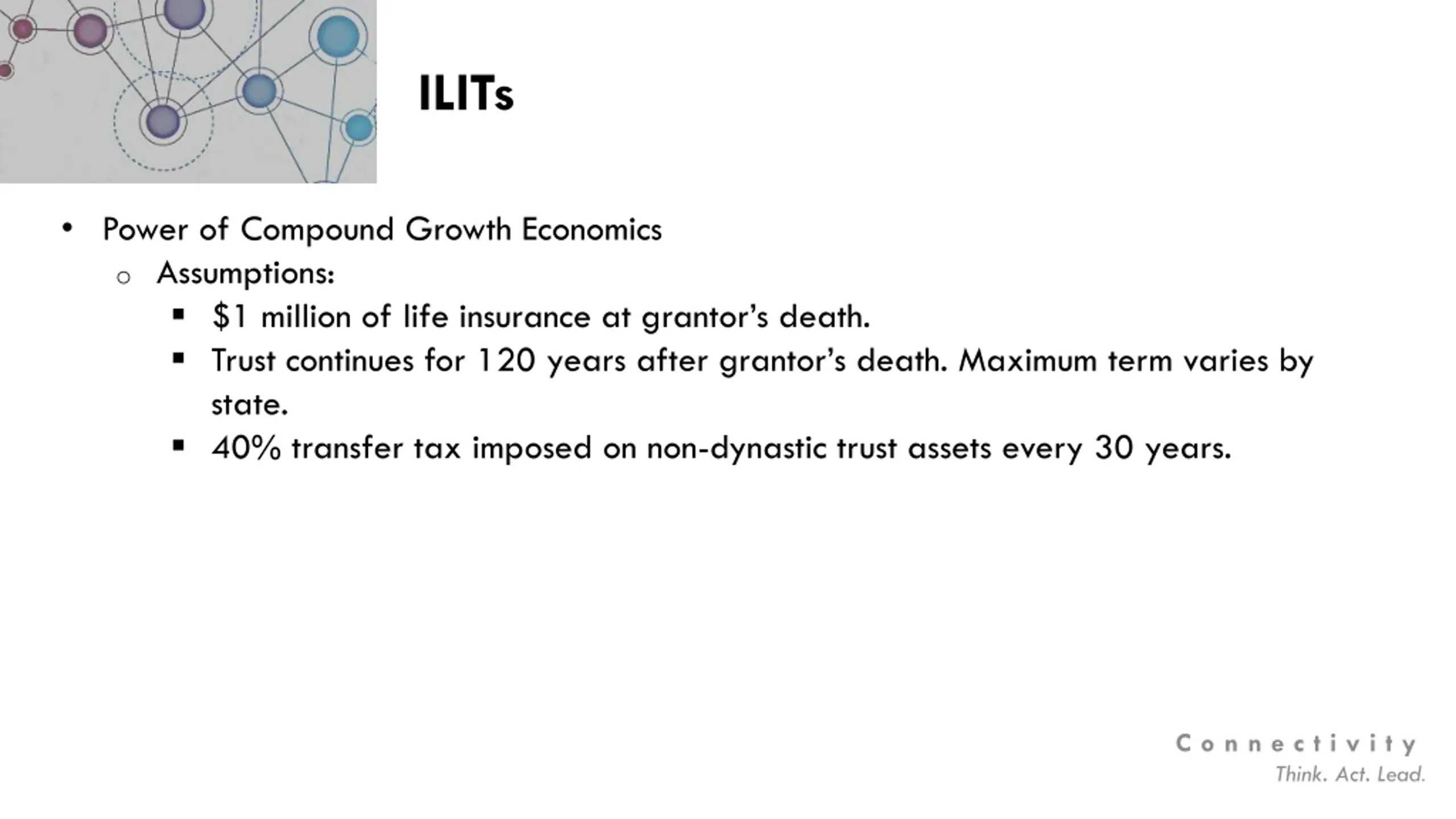 ILITs Power of Compound Growth Economics o Assumptions: $1 million of life insurance at grantor s death. Trust continues for 120 years after grantor s death. Maximum term varies by state. 40% transfer tax imposed on non-dynastic trust assets every 30 years. C o n n e c t i v i t y Think. Act. Lead.