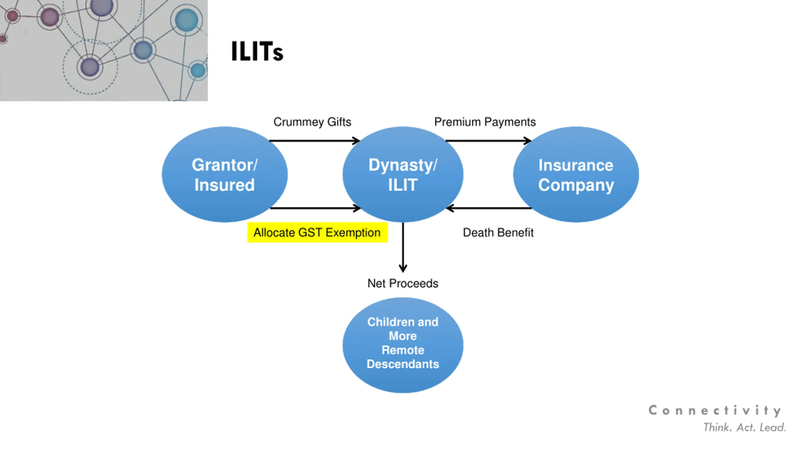 ILITs Crummey Gifts Premium Payments Grantor/ Insured Dynasty/ ILIT Insurance Company Allocate GST Exemption Death Benefit Net Proceeds Children and More Remote Descendants C o n n e c t i v i t y Think. Act. Lead.