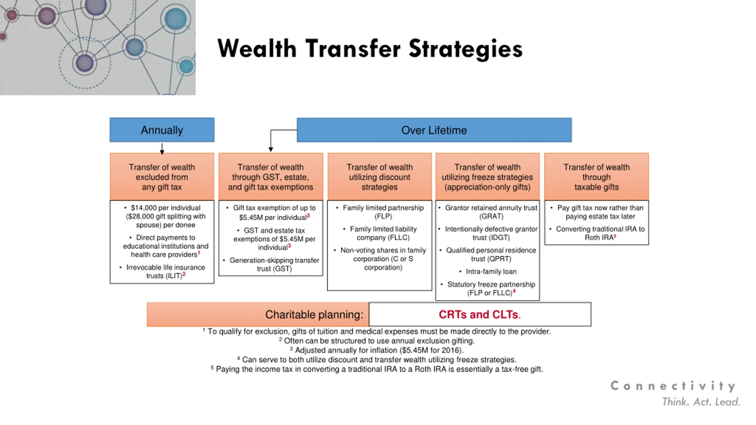 Wealth Transfer Strategies Annually Over Lifetime Transfer of wealth excluded from any gift tax Transfer of wealth through GST, estate, and gift tax exemptions Transfer of wealth utilizing discount strategies Transfer of wealth utilizing freeze strategies (appreciation-only gifts) Transfer of wealth through taxable gifts $14,000 per individual ($28,000 gift splitting with spouse) per donee Gift tax exemption of up to $5.45M per individual3 Family limited partnership (FLP) Grantor retained annuity trust (GRAT) Pay gift tax now rather than paying estate tax later Family limited liability company (FLLC) Intentionally defective grantor trust (IDGT) Converting traditional IRA to Roth IRA5 GST and estate tax exemptions of $5.45M per individual3 Direct payments to educational institutions and health care providers1 Non-voting shares in family corporation (C or S corporation) Qualified personal residence trust (QPRT) Generation-skipping transfer trust (GST) Irrevocable life insurance trusts (ILIT)2 Intra-family loan Statutory freeze partnership (FLP or FLLC)4 Charitable planning: CRTs and CLTs. 1 To qualify for exclusion, gifts of tuition and medical expenses must be made directly to the provider. 2 Often can be structured to use annual exclusion gifting. 3 Adjusted annually for inflation ($5.45M for 2016). 4 Can serve to both utilize discount and transfer wealth utilizing freeze strategies. 5 Paying the income tax in converting a traditional IRA to a Roth IRA is essentially a tax-free gift. C o n n e c t i v i t y Think. Act. Lead.