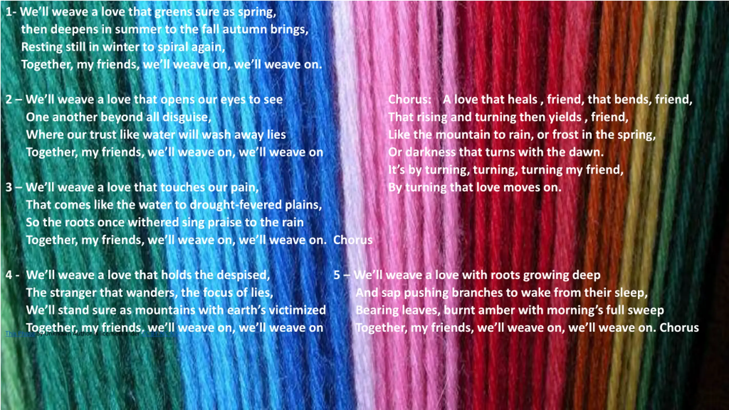 1- Well weave a love that greens sure as spring, then deepens in summer to the fall autumn brings, Resting still in winter to spiral again, Together, my friends, we ll weave on, we ll weave on. 2 We ll weave a love that opens our eyes to see One another beyond all disguise, Where our trust like water will wash away lies Together, my friends, we ll weave on, we ll weave on 3 We ll weave a love that touches our pain, That comes like the water to drought-fevered plains, So the roots once withered sing praise to the rain Together, my friends, we ll weave on, we ll weave on. Chorus Chorus: A love that heals , friend, that bends, friend, That rising and turning then yields , friend, Like the mountain to rain, or frost in the spring, Or darkness that turns with the dawn. It s by turning, turning, turning my friend, By turning that love moves on. 4 - We ll weave a love that holds the despised, The stranger that wanders, the focus of lies, We ll stand sure as mountains with earth s victimizedBearing leaves, burnt amber with morning s full sweep Together, my friends, we ll weave on, we ll weave onTogether, my friends, we ll weave on, we ll weave on. Chorus This Photo by Unknown Author is licensed under CC BY-NC-ND 5 We ll weave a love with roots growing deep And sap pushing branches to wake from their sleep,