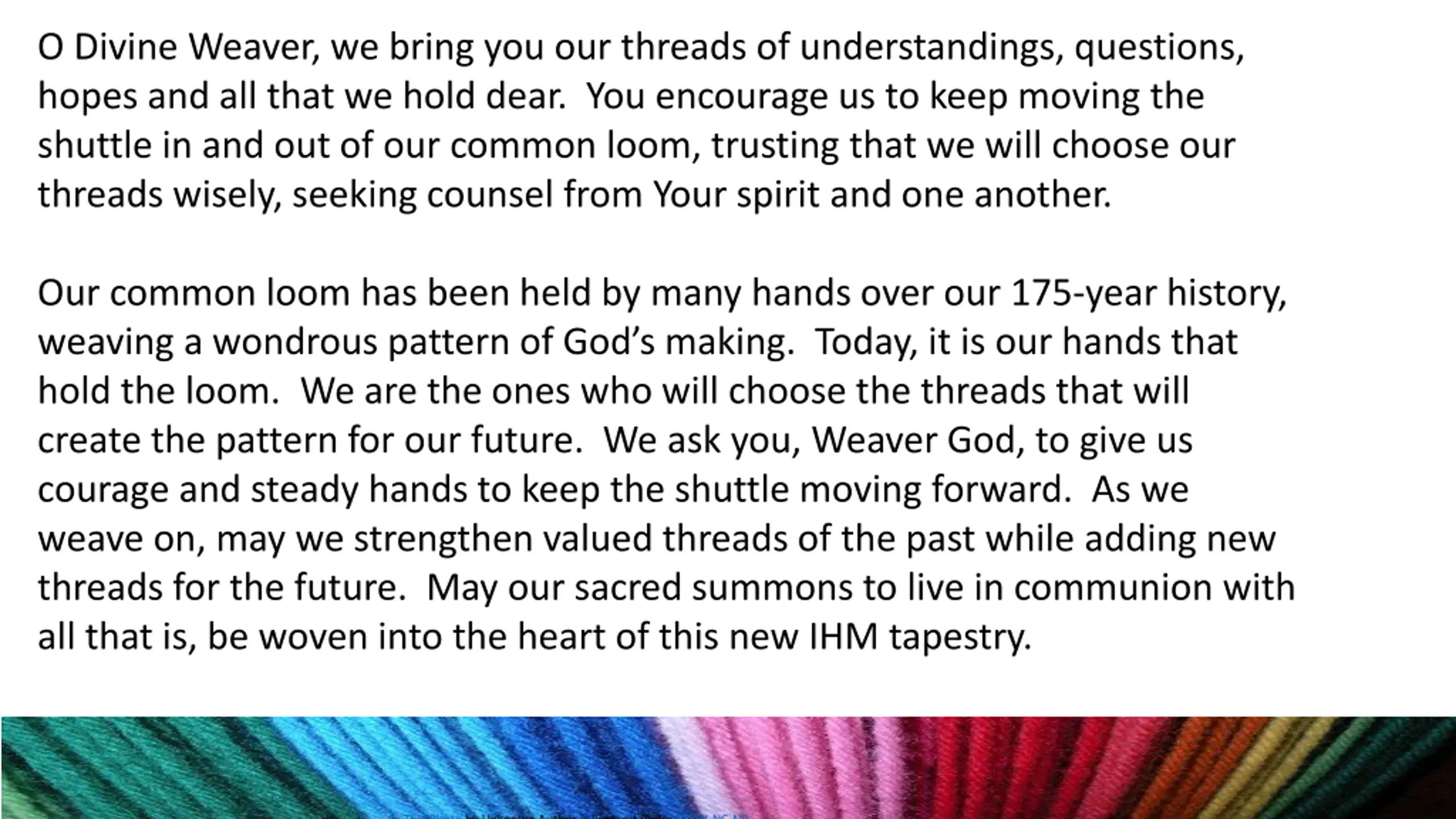 O Divine Weaver, we bring you our threads of understandings, questions, hopes and all that we hold dear. You encourage us to keep moving the shuttle in and out of our common loom, trusting that we will choose our threads wisely, seeking counsel from Your spirit and one another. Our common loom has been held by many hands over our 175-year history, weaving a wondrous pattern of God s making. Today, it is our hands that hold the loom. We are the ones who will choose the threads that will create the pattern for our future. We ask you, Weaver God, to give us courage and steady hands to keep the shuttle moving forward. As we weave on, may we strengthen valued threads of the past while adding new threads for the future. May our sacred summons to live in communion with all that is, be woven into the heart of this new IHM tapestry. This Photo by Unknown Author is licensed under CC BY-NC-ND