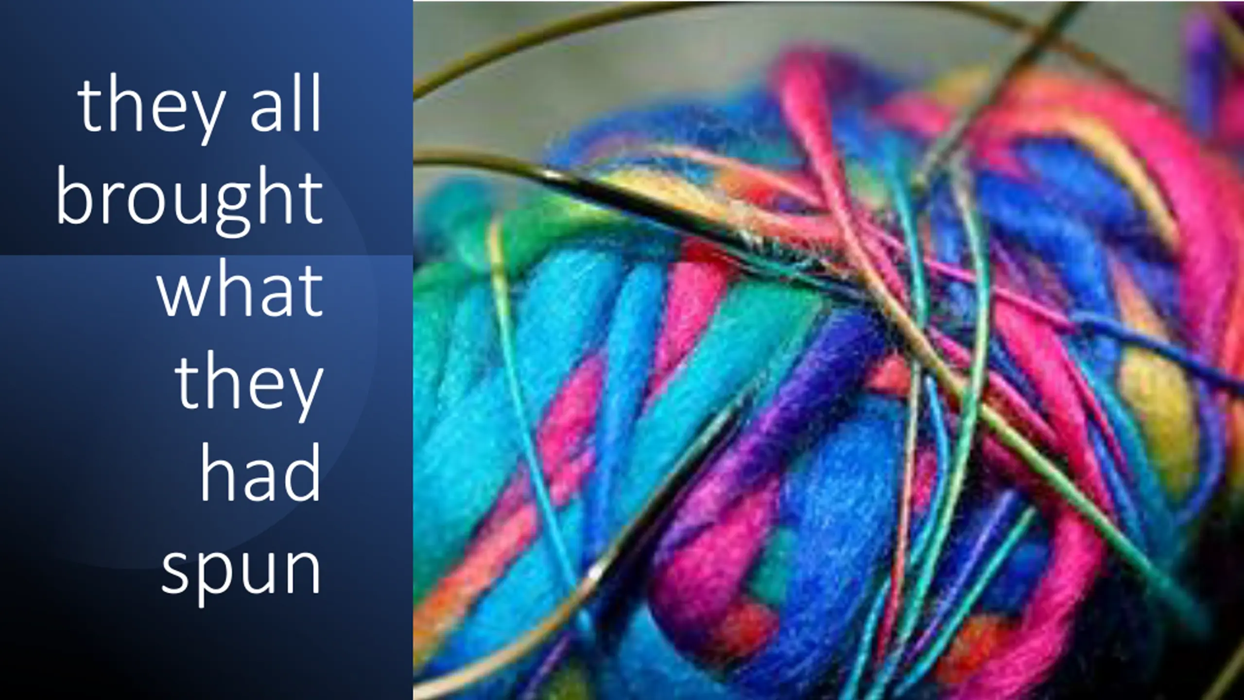And every skillful woman spun with her hands, and they all brought what they had spun in blue and purple and scarlet yarns and fine twined linen. (Ex 35:25)