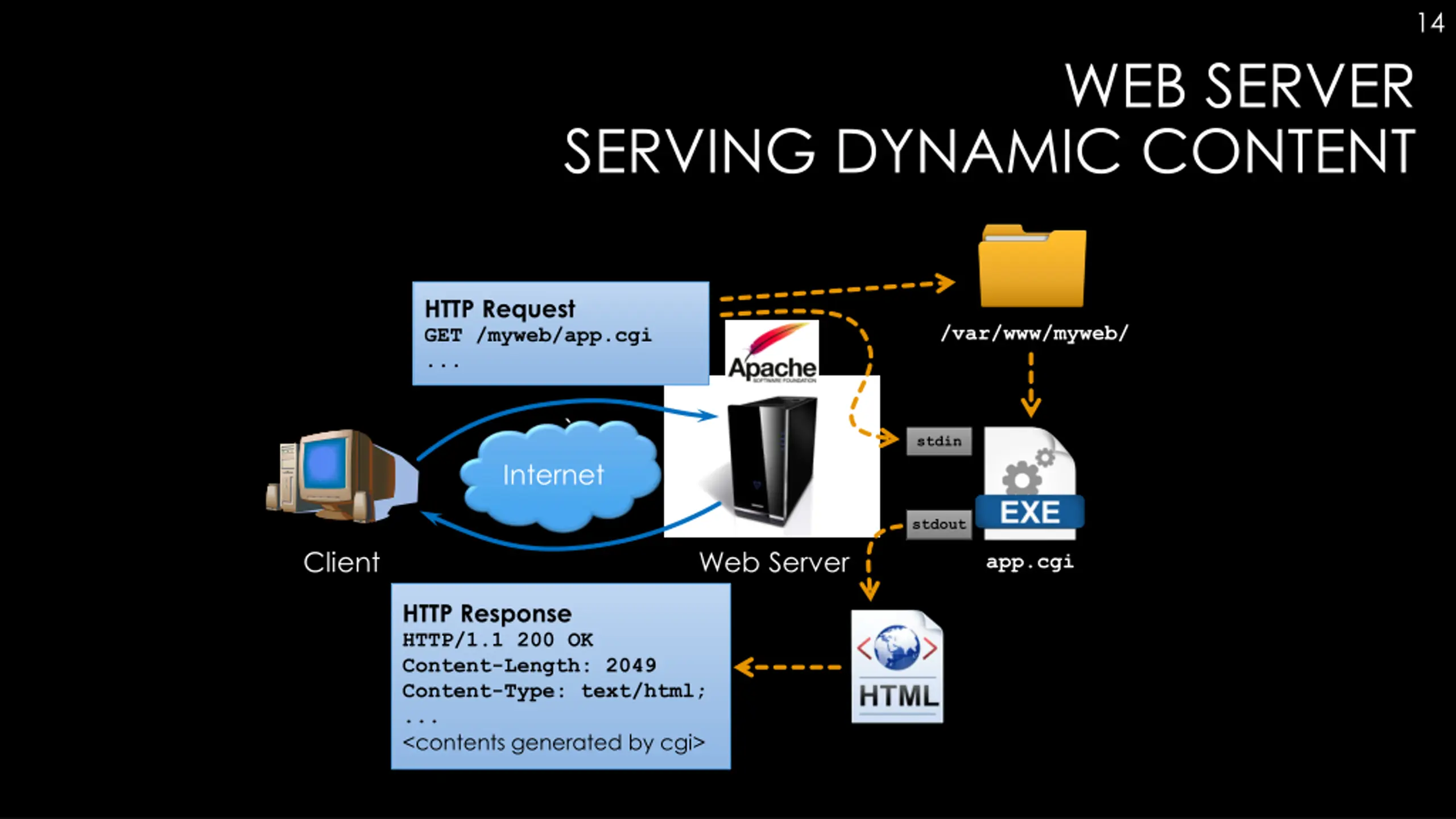 13 WEB SERVER SERVING STATIC PAGES Apache configuration HTTP Request GET /myweb/index.html ... /var/www/myweb/ ` Internet Client Web Server HTTP Response HTTP/1.1 200 OK Content-Length: 1019 Content-Type: text/html; ... <contents of index.html> index.html