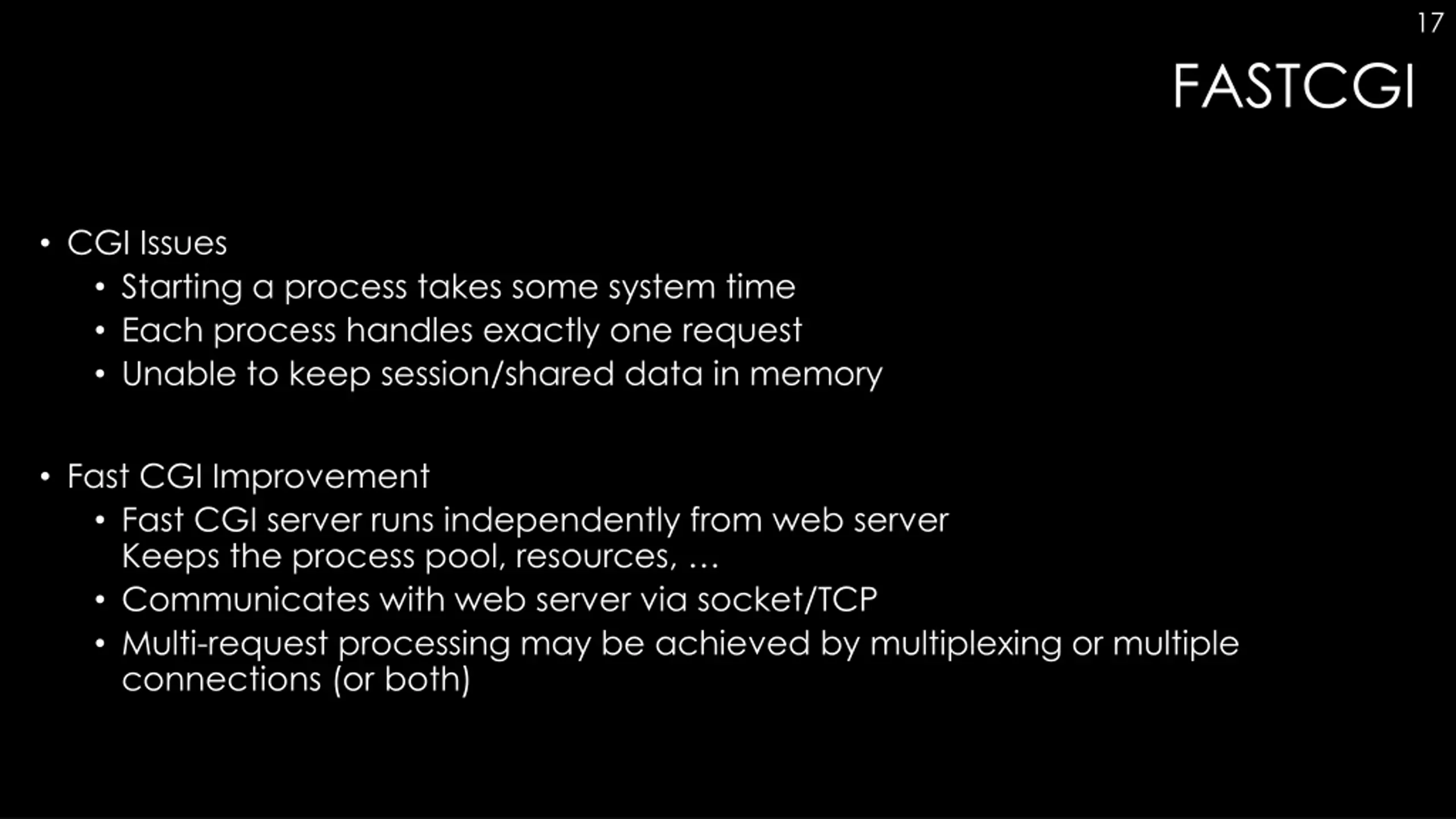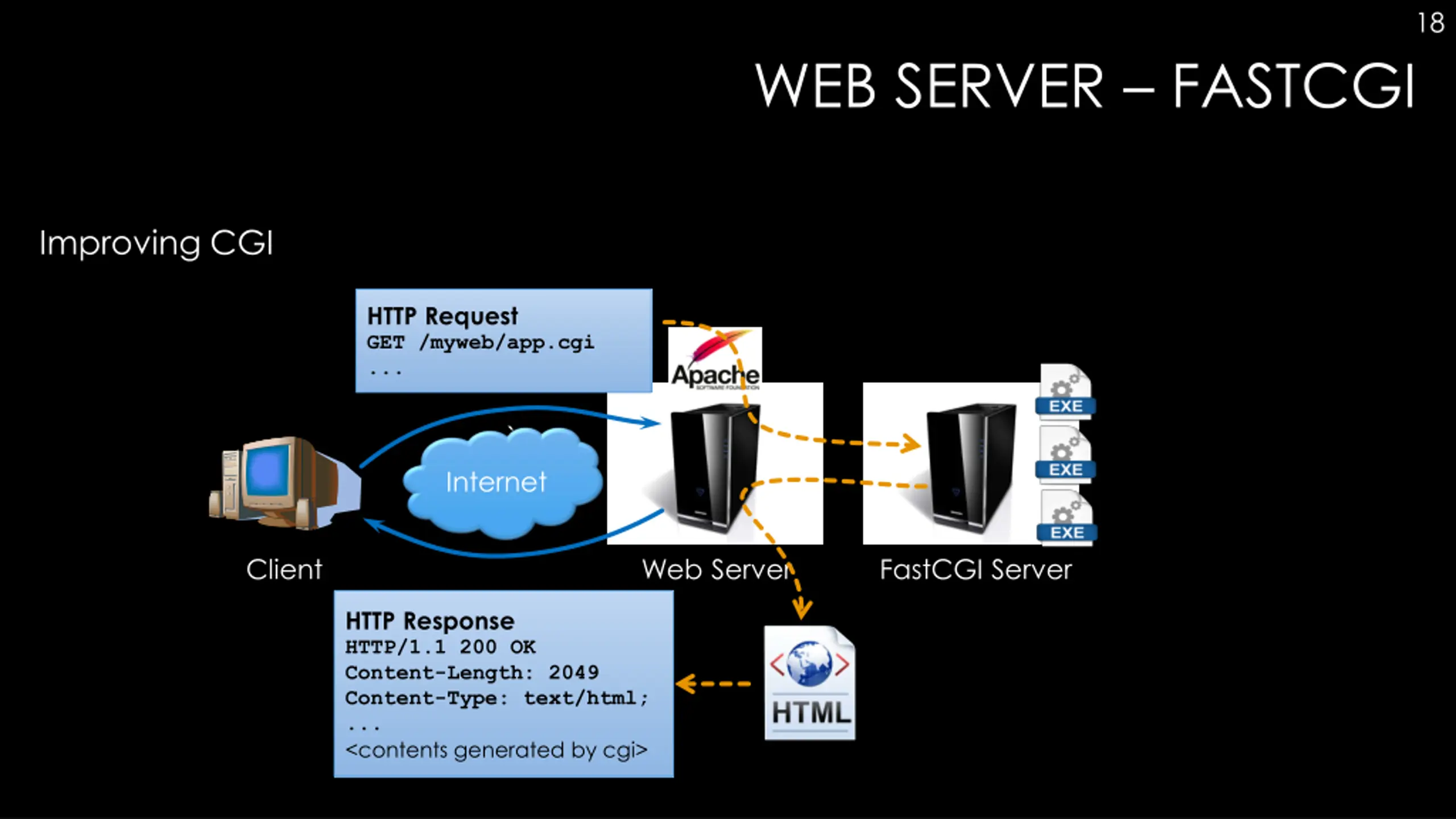 17 FASTCGI CGI Issues Starting a process takes some system time Each process handles exactly one request Unable to keep session/shared data in memory Fast CGI Improvement Fast CGI server runs independently from web server Keeps the process pool, resources, Communicates with web server via socket/TCP Multi-request processing may be achieved by multiplexing or multiple connections (or both)