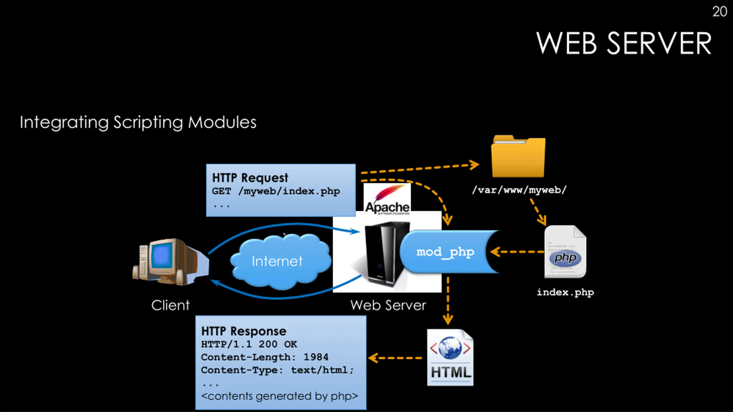 20 WEB SERVER Integrating Scripting Modules HTTP Request GET /myweb/index.php ... /var/www/myweb/ ` mod_php Internet index.php Client Web Server HTTP Response HTTP/1.1 200 OK Content-Length: 1984 Content-Type: text/html; ... <contents generated by php>