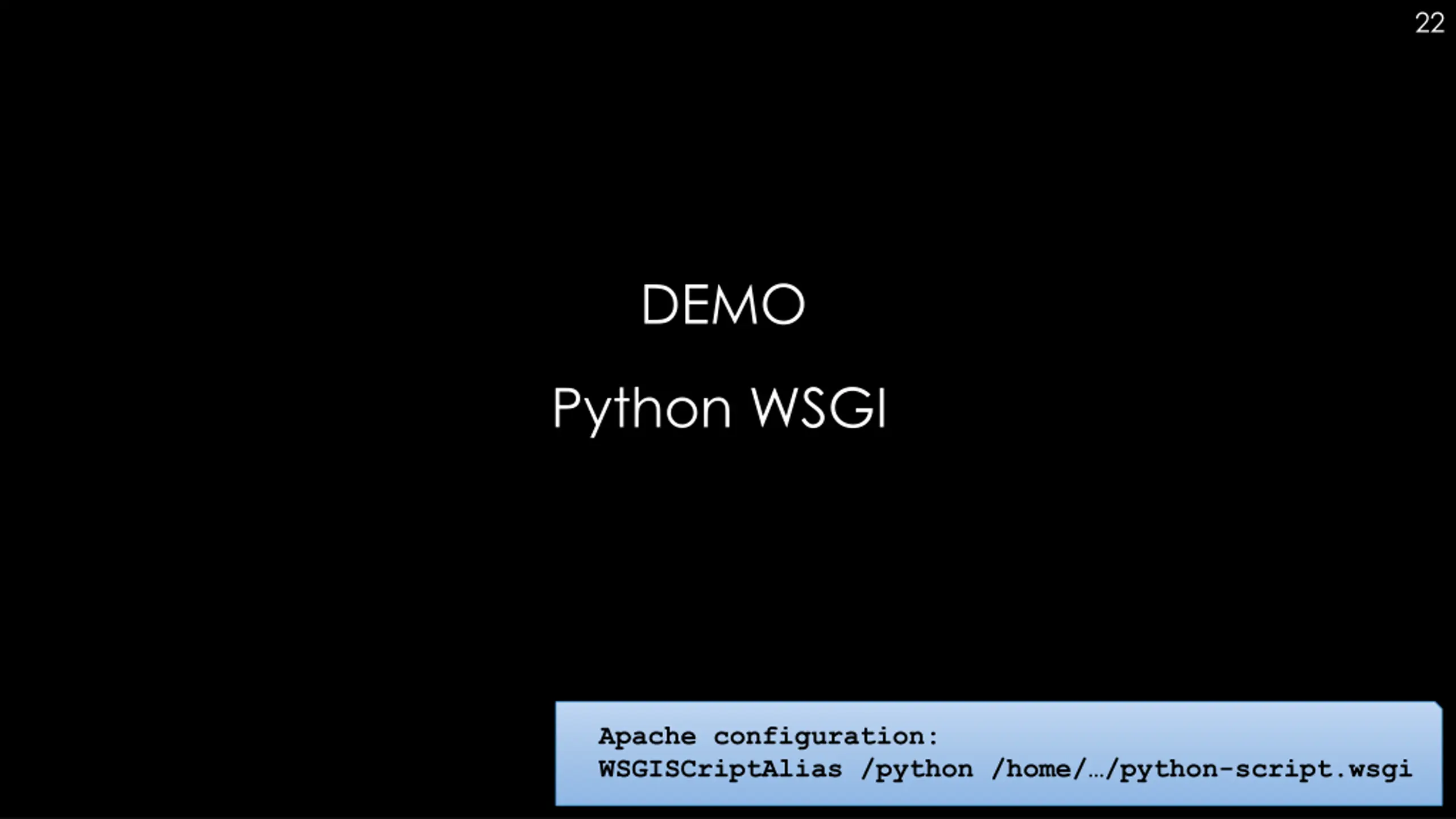 22 DEMO Python WSGI Apache configuration: WSGISCriptAlias /python /home/ /python-script.wsgi