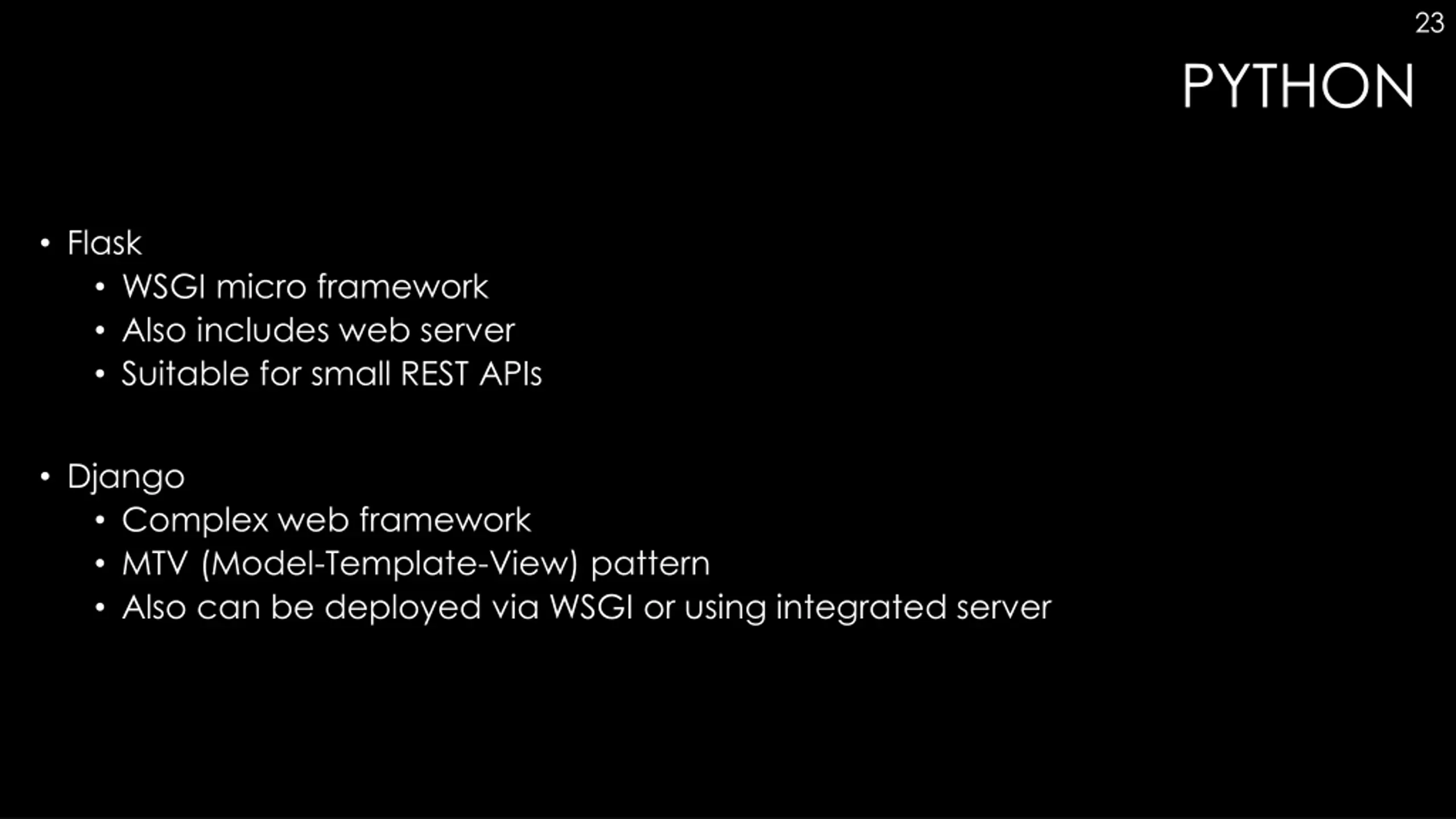 23 PYTHON Flask WSGI micro framework Also includes web server Suitable for small REST APIs Django Complex web framework MTV (Model-Template-View) pattern Also can be deployed via WSGI or using integrated server
