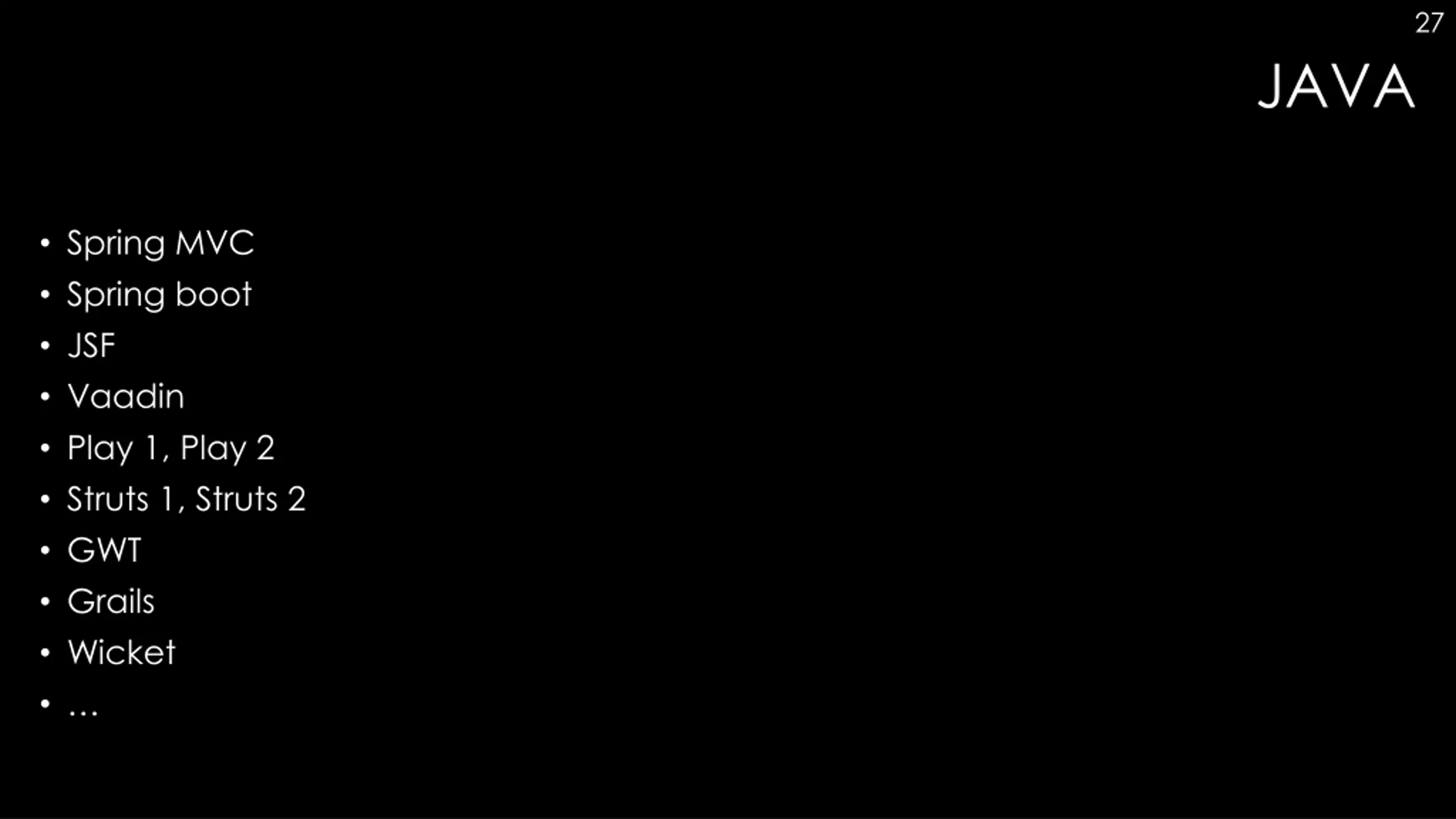 27 JAVA Spring MVC Spring boot JSF Vaadin Play 1, Play 2 Struts 1, Struts 2 GWT Grails Wicket