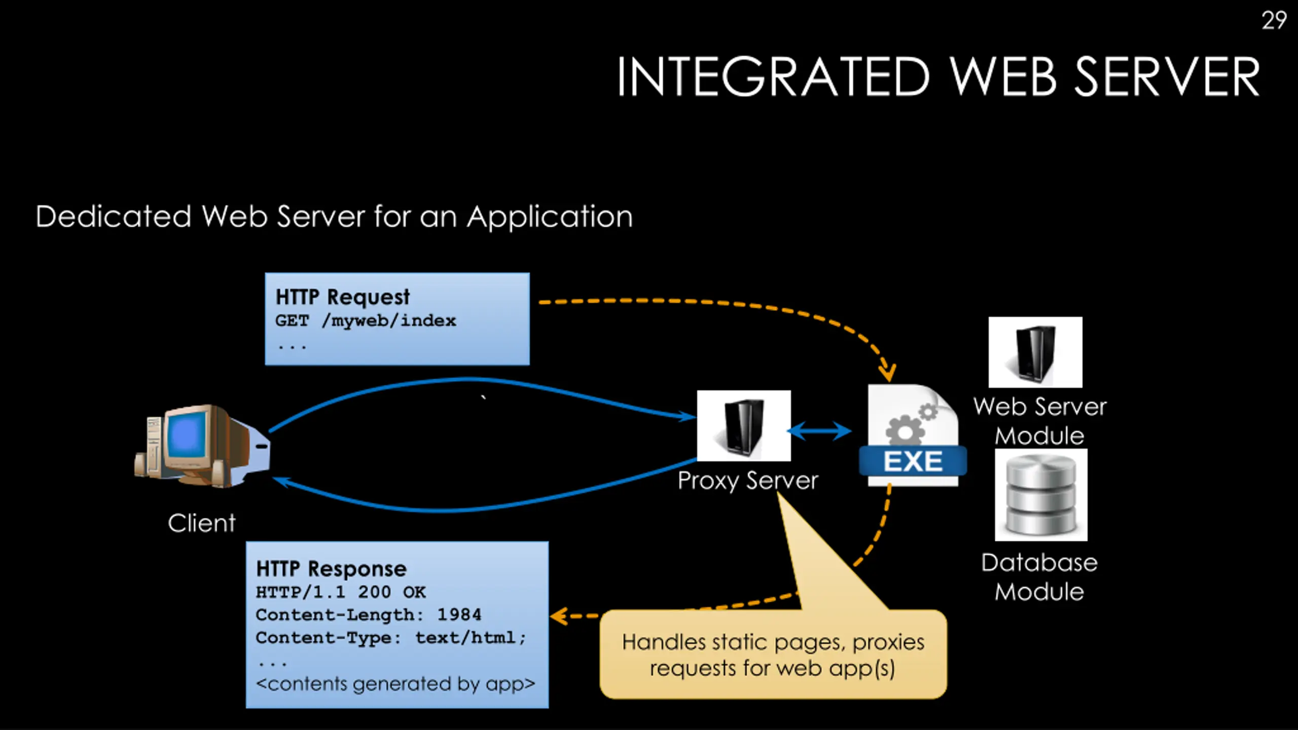 29 INTEGRATED WEB SERVER Dedicated Web Server for an Application HTTP Request GET /myweb/index ... ` Web Server Module Proxy Server Client Database Module HTTP Response HTTP/1.1 200 OK Content-Length: 1984 Content-Type: text/html; ... <contents generated by app> Handles static pages, proxies requests for web app(s)