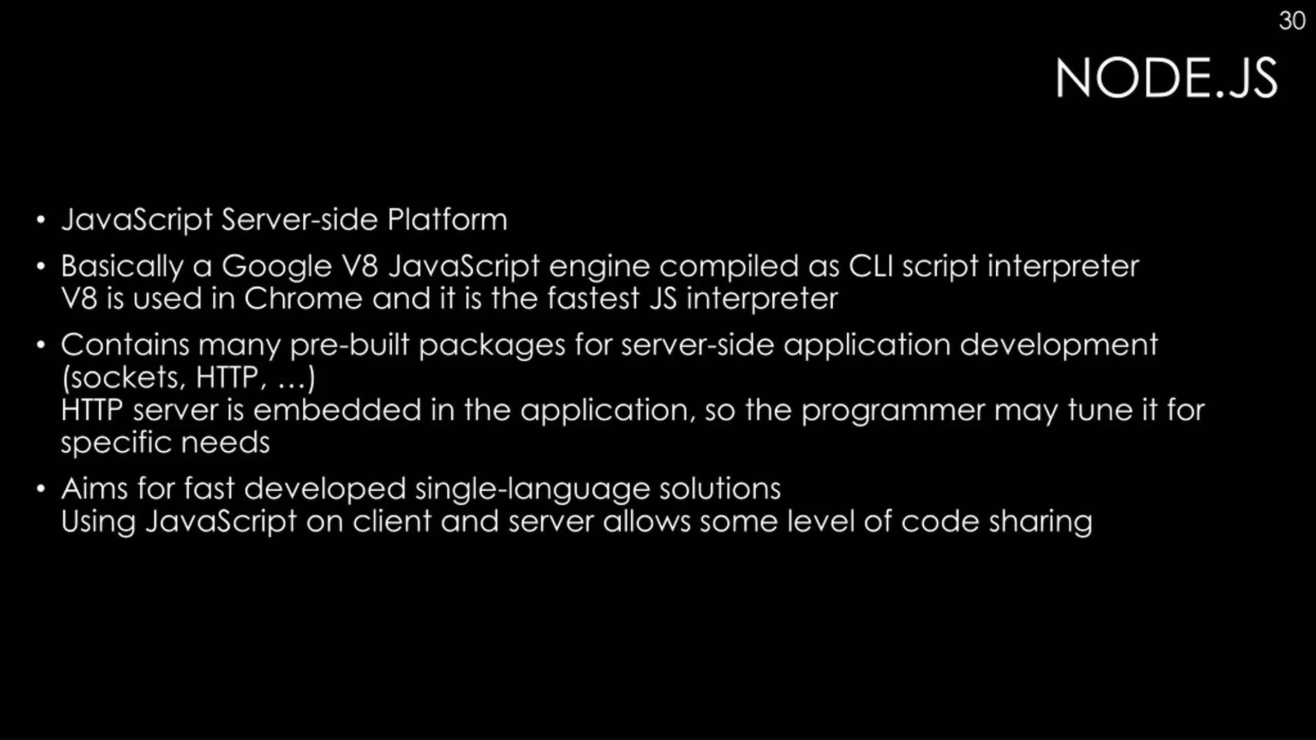 30 NODE.JS JavaScript Server-side Platform Basically a Google V8 JavaScript engine compiled as CLI script interpreter V8 is used in Chrome and it is the fastest JS interpreter Contains many pre-built packages for server-side application development (sockets, HTTP, ) HTTP server is embedded in the application, so the programmer may tune it for specific needs Aims for fast developed single-language solutions Using JavaScript on client and server allows some level of code sharing