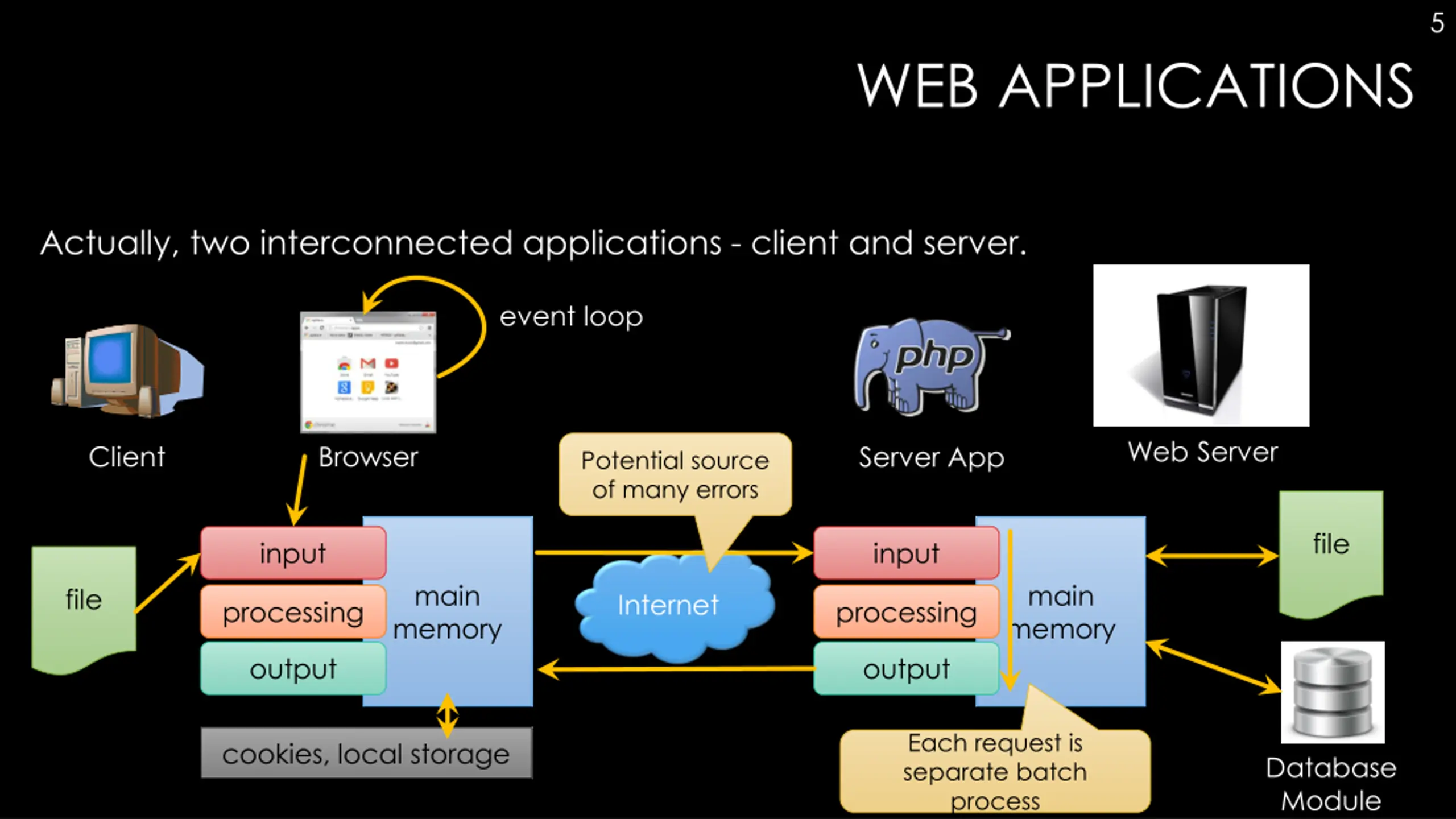 5 WEB APPLICATIONS Actually, two interconnected applications - client and server. event loop Web Server Client Browser Server App Potential source of many errors file input input main memory main memory file Internet processing processing output output Each request is separate batch process cookies, local storage Database Module
