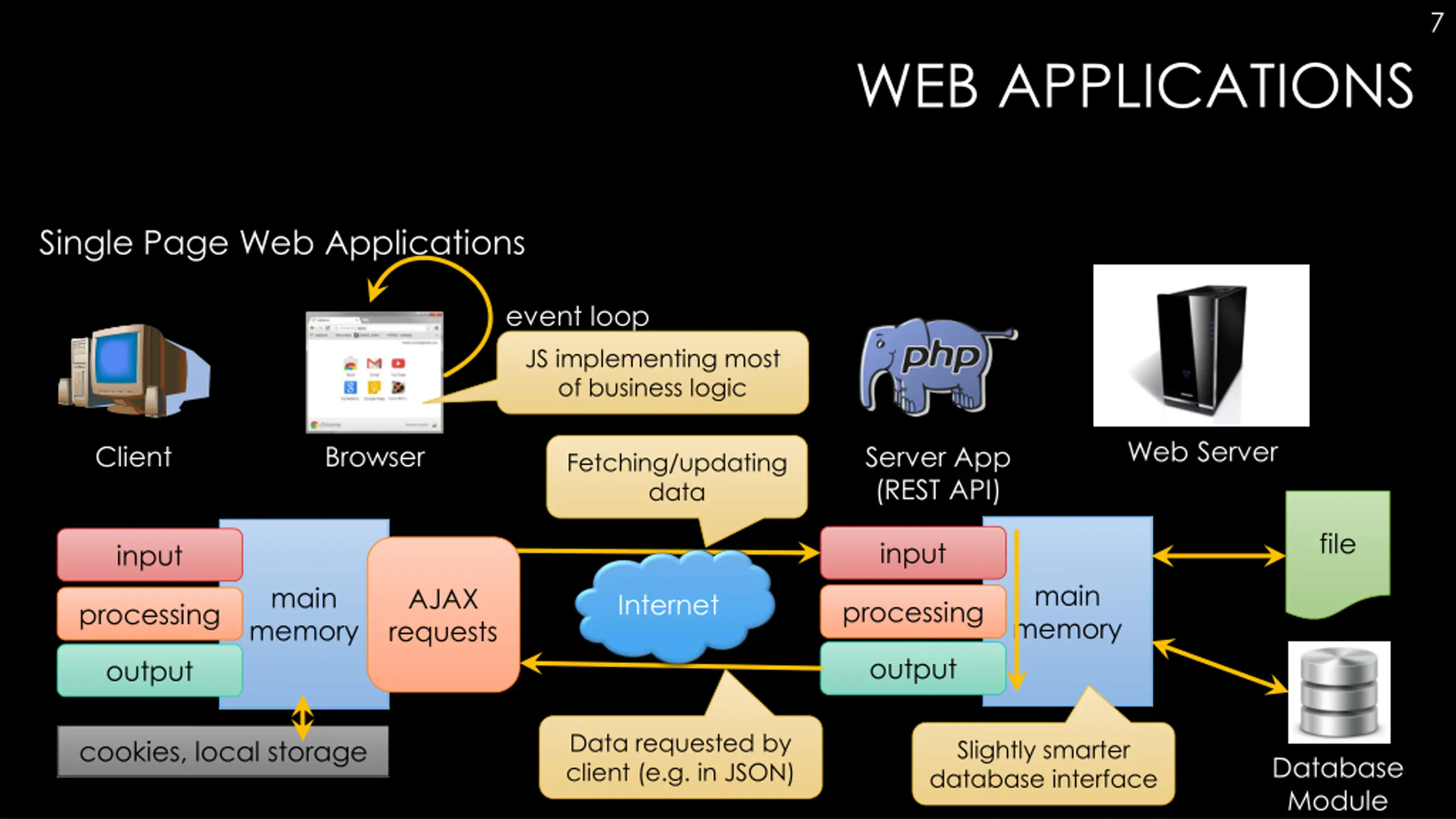 7 WEB APPLICATIONS Single Page Web Applications event loop JS implementing most of business logic Web Server Client Browser Server App (REST API) Fetching/updating data file input input main memory main memory AJAX requests Internet processing processing output output Data requested by client (e.g. in JSON) cookies, local storage Slightly smarter database interface Database Module