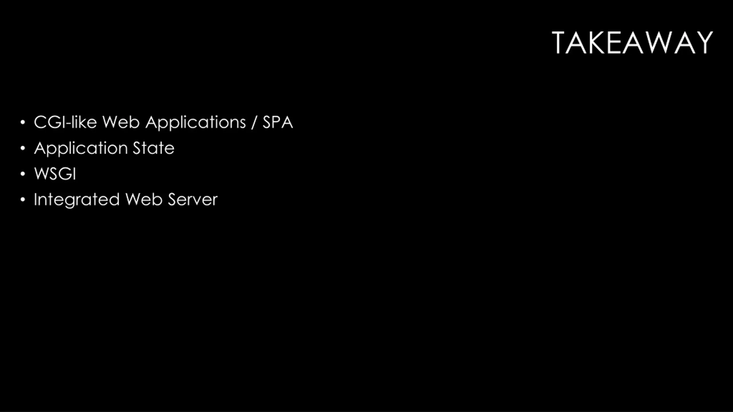 TAKEAWAY CGI-like Web Applications / SPA Application State WSGI Integrated Web Server