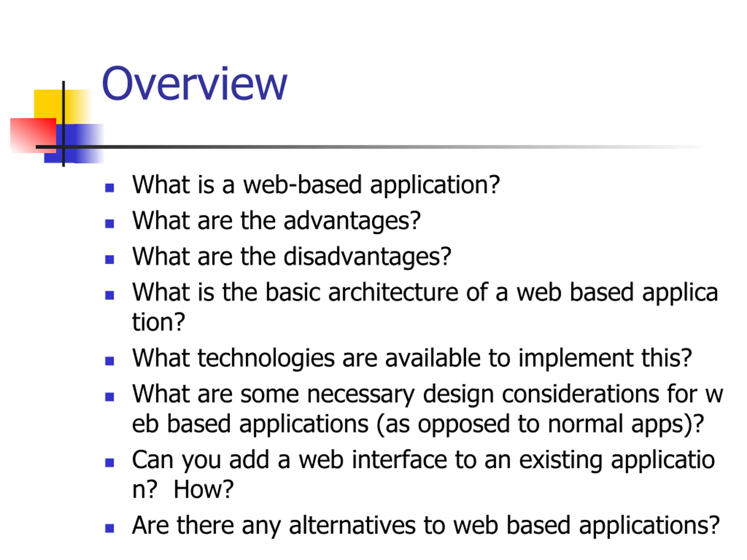 Overview What is a web-based application? What are the advantages? What are the disadvantages? What is the basic architecture of a web based applica tion? What technologies are available to implement this? What are some necessary design considerations for w eb based applications (as opposed to normal apps)? Can you add a web interface to an existing applicatio n? How? Are there any alternatives to web based applications?