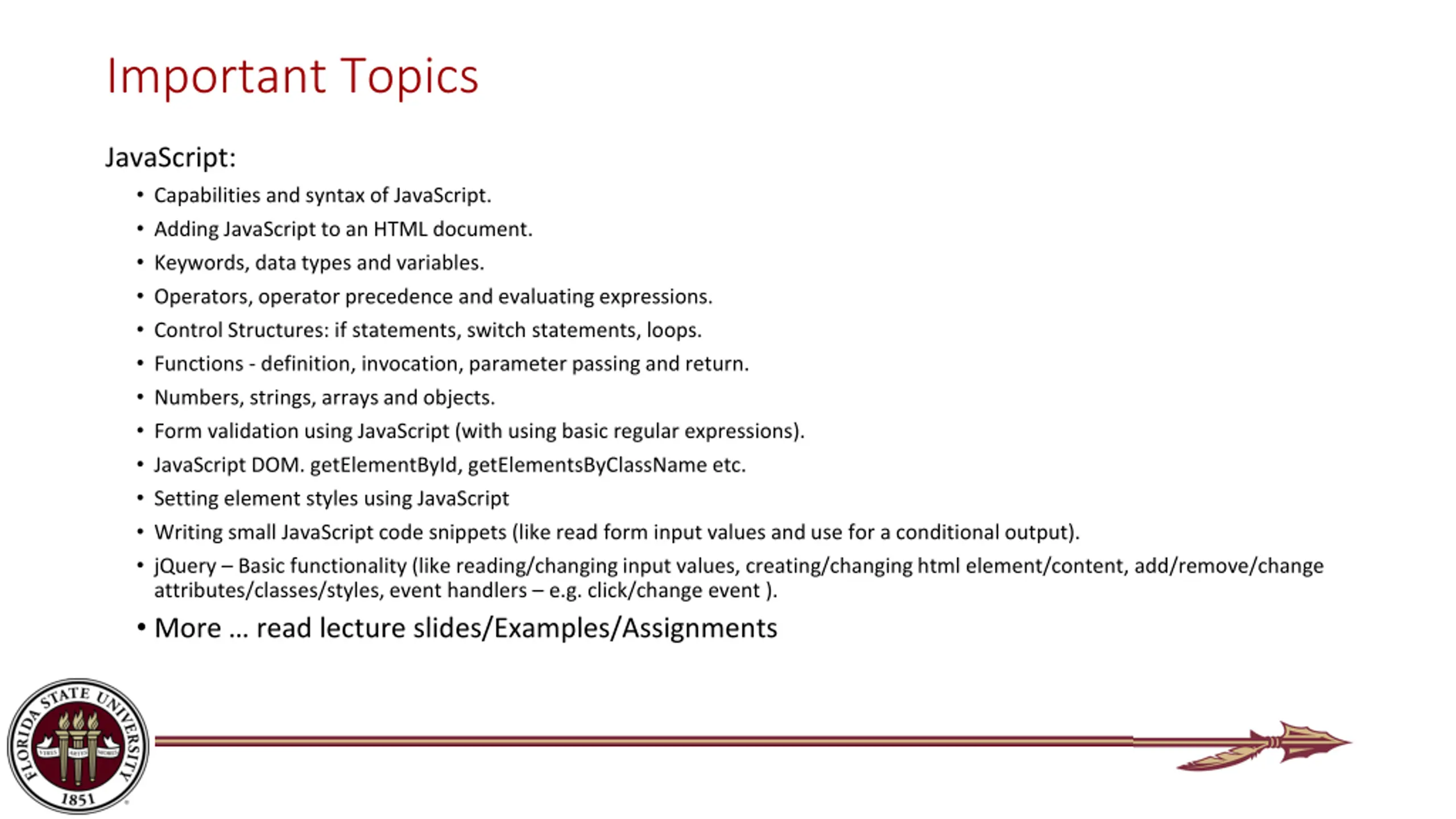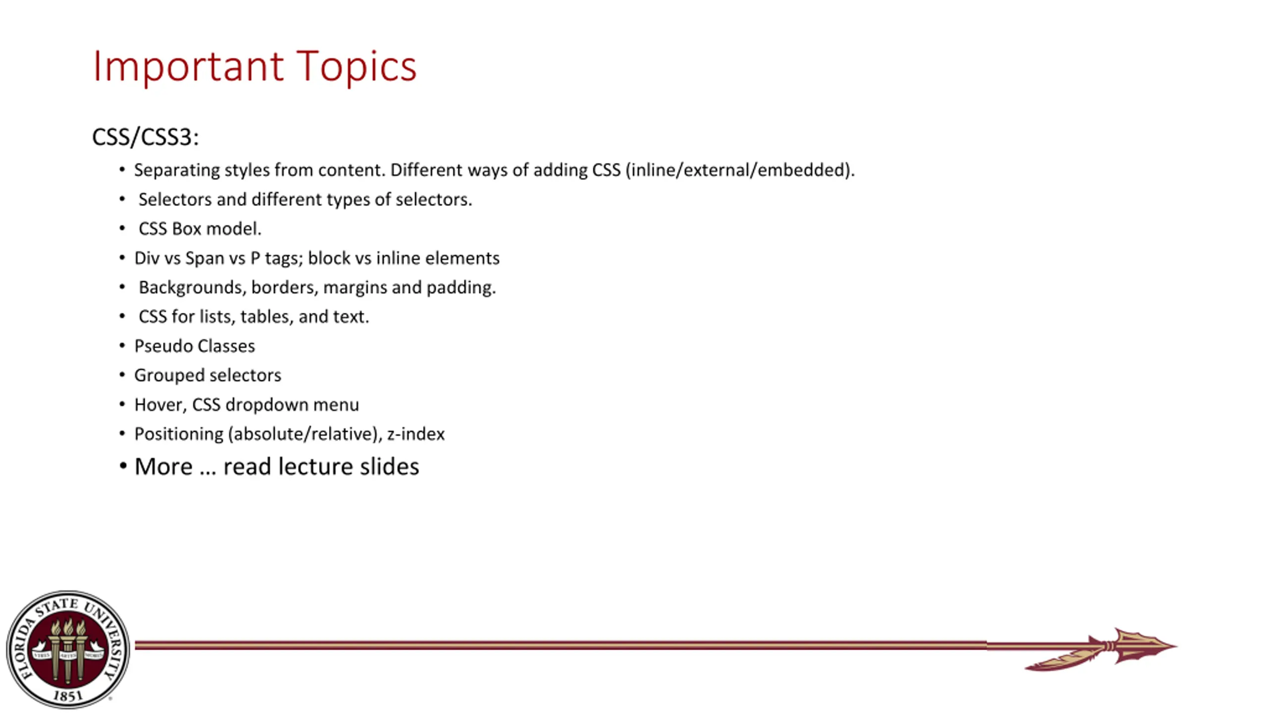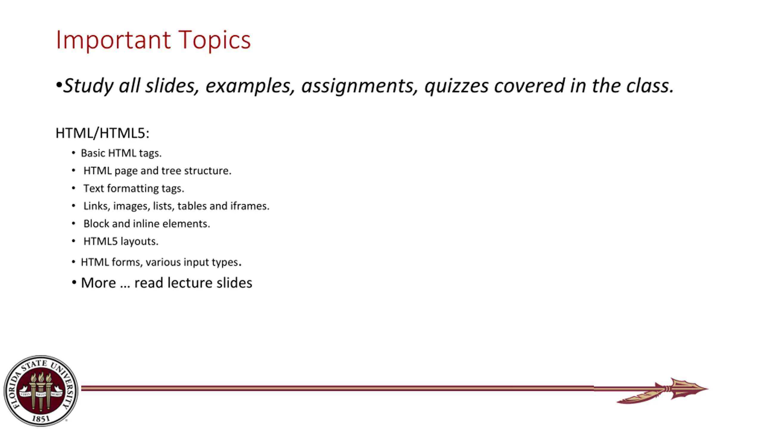 Important Topics Study all slides, examples, assignments, quizzes covered in the class. HTML/HTML5: Basic HTML tags. HTML page and tree structure. Text formatting tags. Links, images, lists, tables and iframes. Block and inline elements. HTML5 layouts. HTML forms, various input types. More read lecture slides
