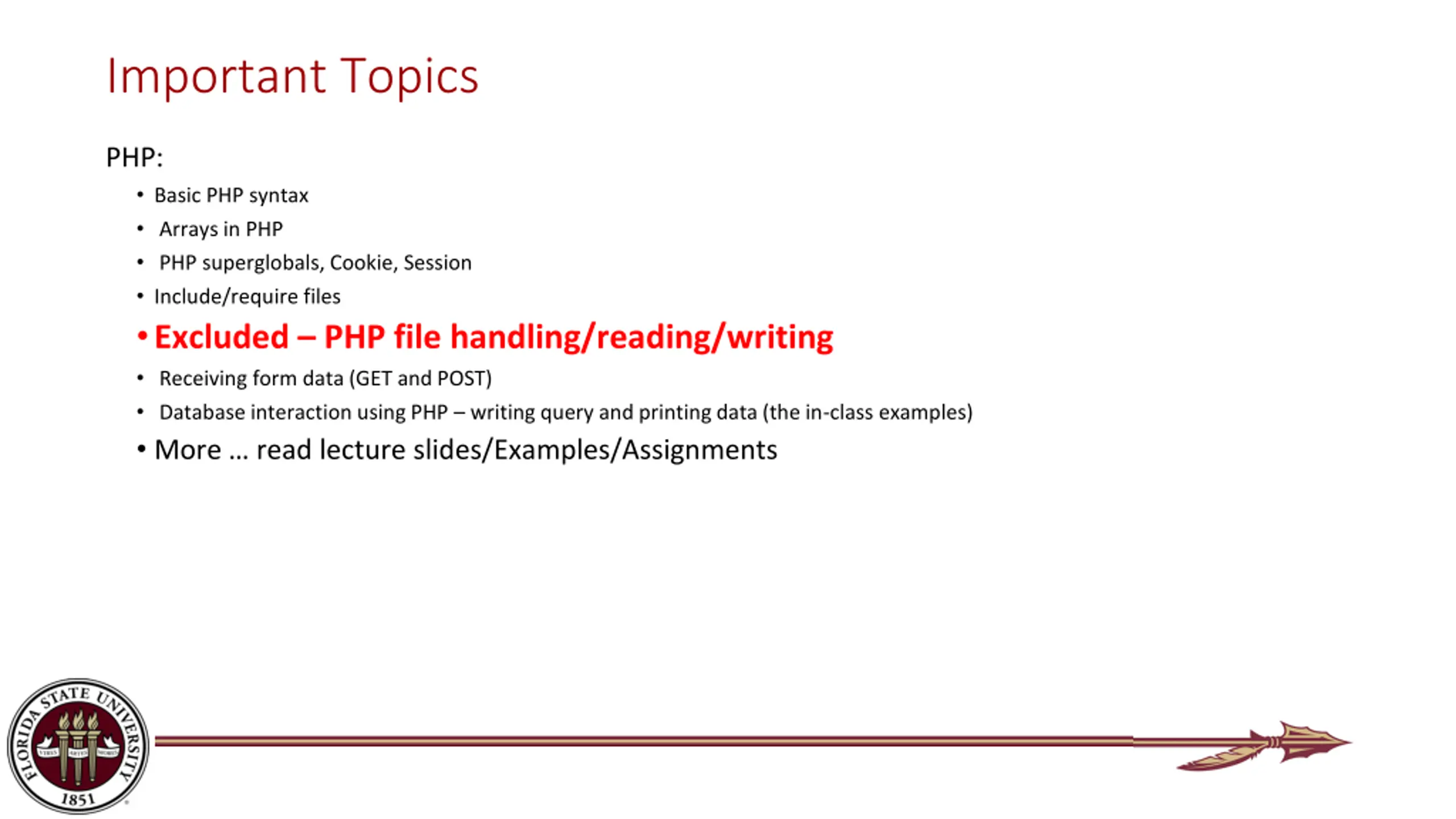 Important Topics PHP: Basic PHP syntax Arrays in PHP PHP superglobals, Cookie, Session Include/require files Excluded PHP file handling/reading/writing Receiving form data (GET and POST) Database interaction using PHP writing query and printing data (the in-class examples) More read lecture slides/Examples/Assignments