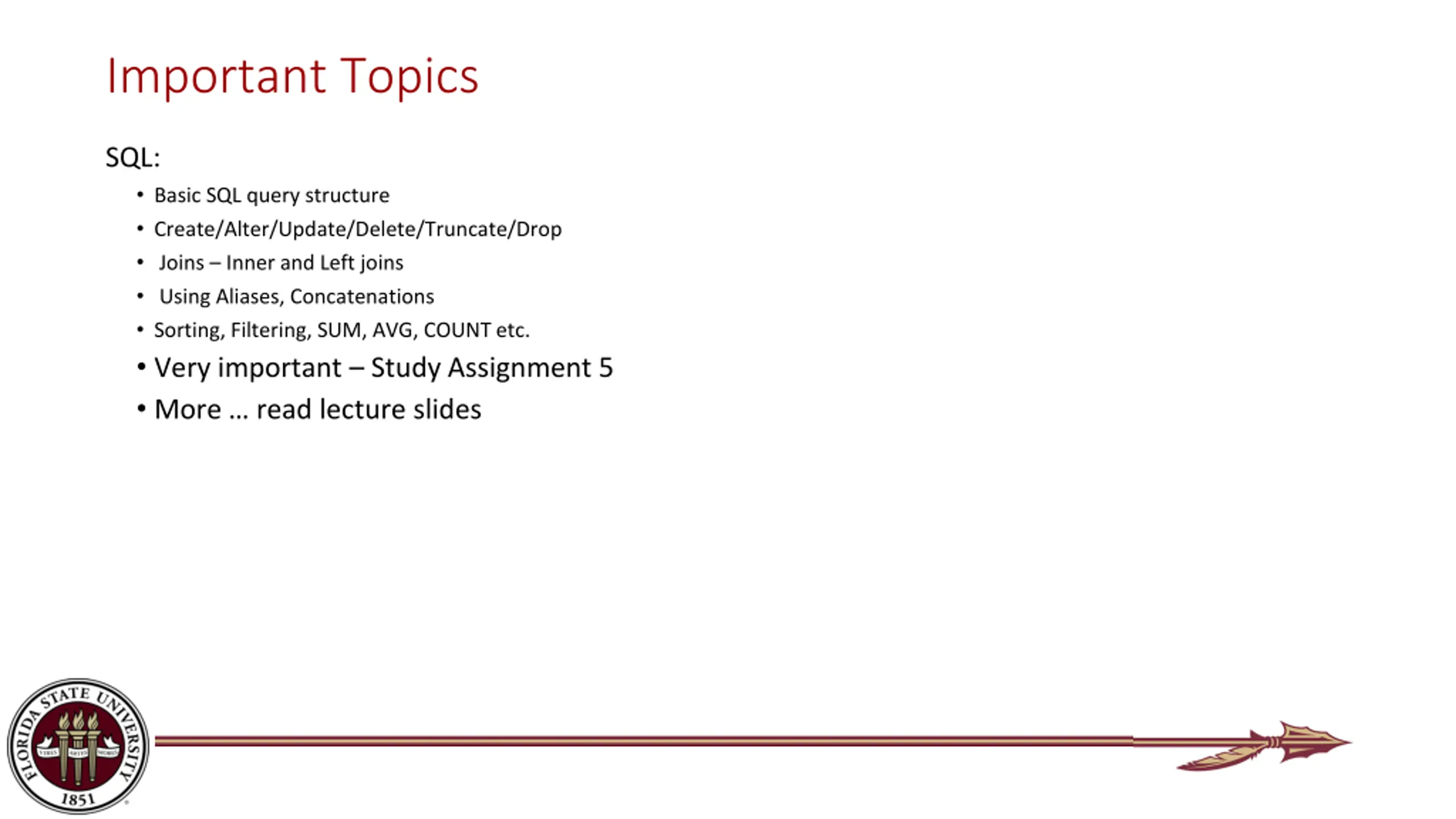 Important Topics SQL: Basic SQL query structure Create/Alter/Update/Delete/Truncate/Drop Joins Inner and Left joins Using Aliases, Concatenations Sorting, Filtering, SUM, AVG, COUNT etc. Very important Study Assignment 5 More read lecture slides