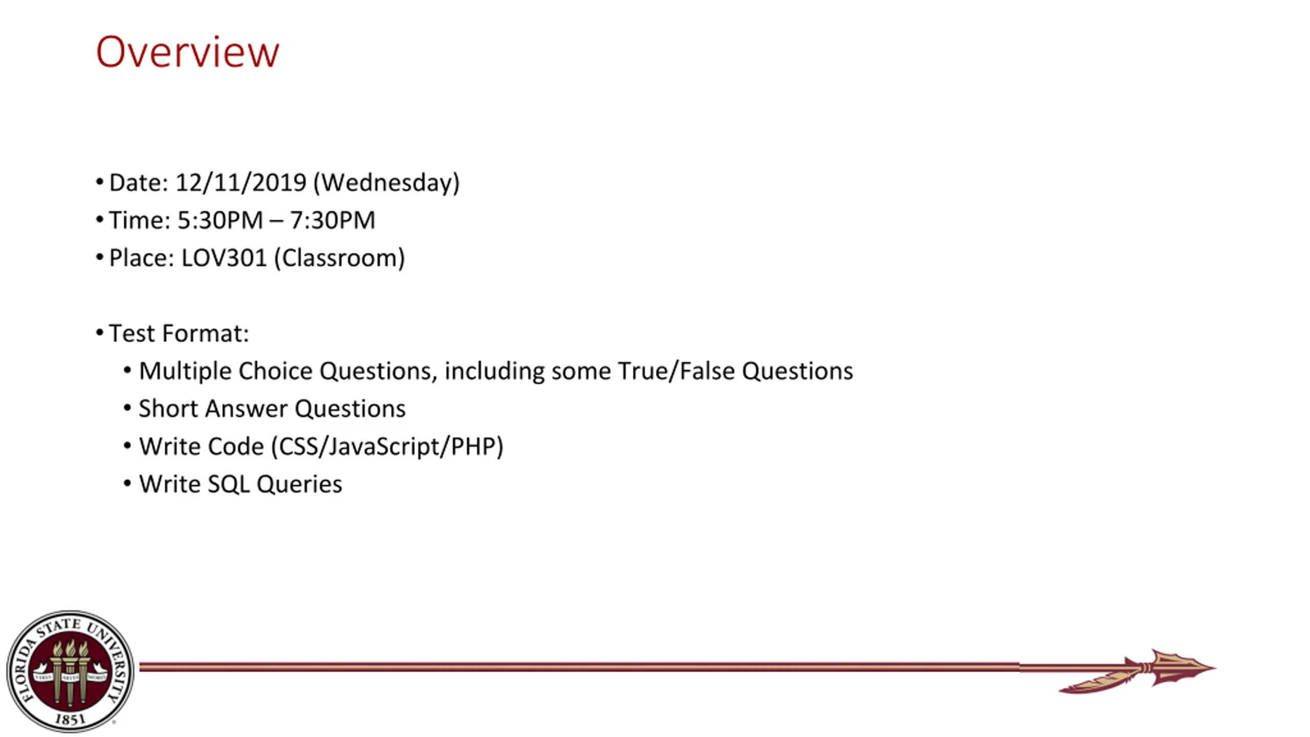 Overview Date: 12/11/2019 (Wednesday) Time: 5:30PM 7:30PM Place: LOV301 (Classroom) Test Format: Multiple Choice Questions, including some True/False Questions Short Answer Questions Write Code (CSS/JavaScript/PHP) Write SQL Queries