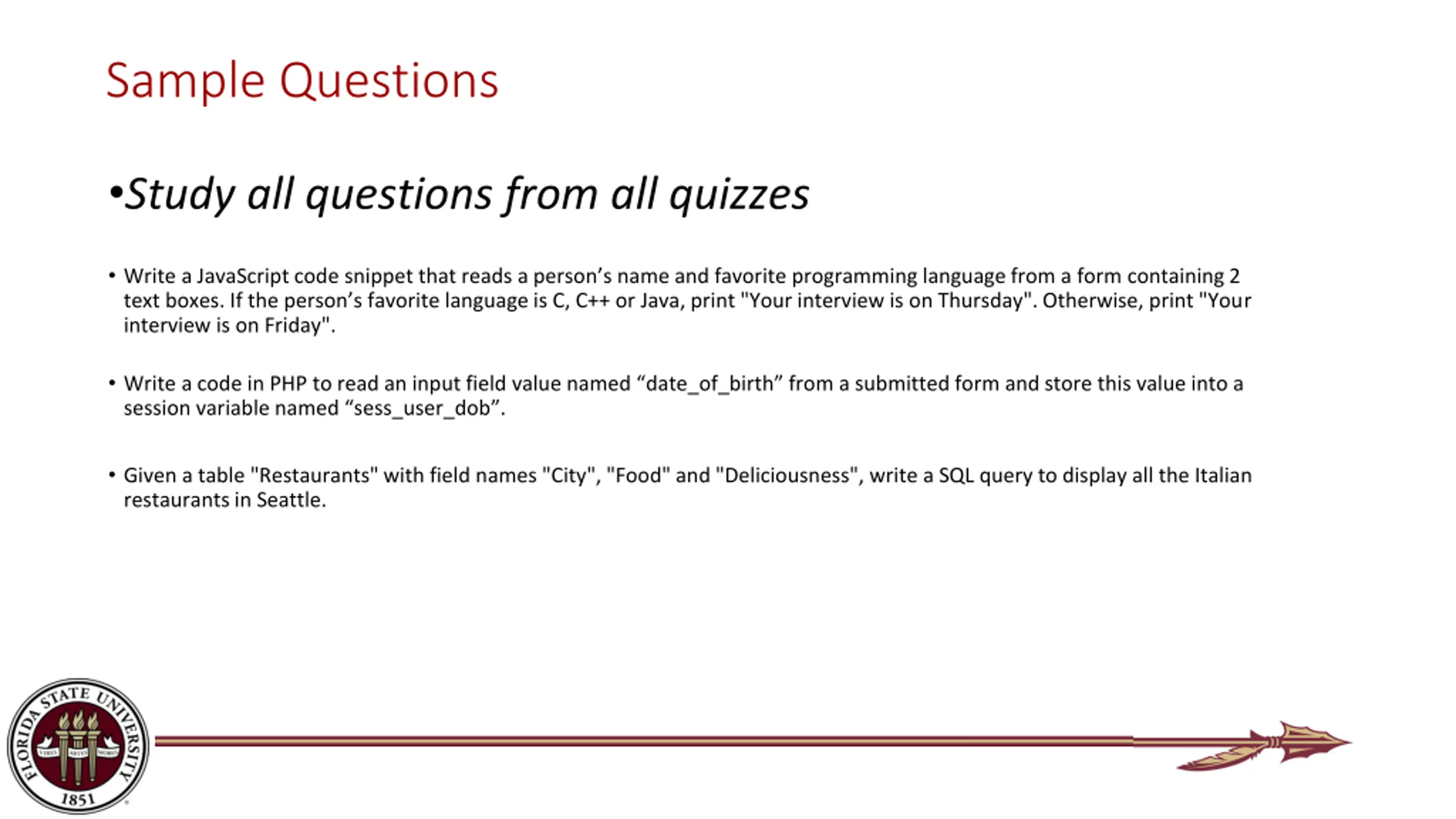 Sample Questions Study all questions from all quizzes Write a JavaScript code snippet that reads a person s name and favorite programming language from a form containing 2 text boxes. If the person s favorite language is C, C++ or Java, print "Your interview is on Thursday". Otherwise, print "Your interview is on Friday". Write a code in PHP to read an input field value named date_of_birth from a submitted form and store this value into a session variable named sess_user_dob . Given a table "Restaurants" with field names "City", "Food" and "Deliciousness", write a SQL query to display all the Italian restaurants in Seattle.