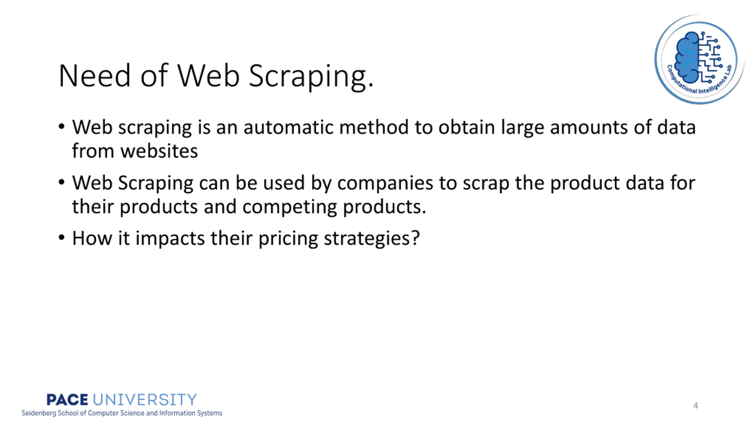 Need of Web Scraping. Web scraping is an automatic method to obtain large amounts of data from websites Web Scraping can be used by companies to scrap the product data for their products and competing products. How it impacts their pricing strategies? 4