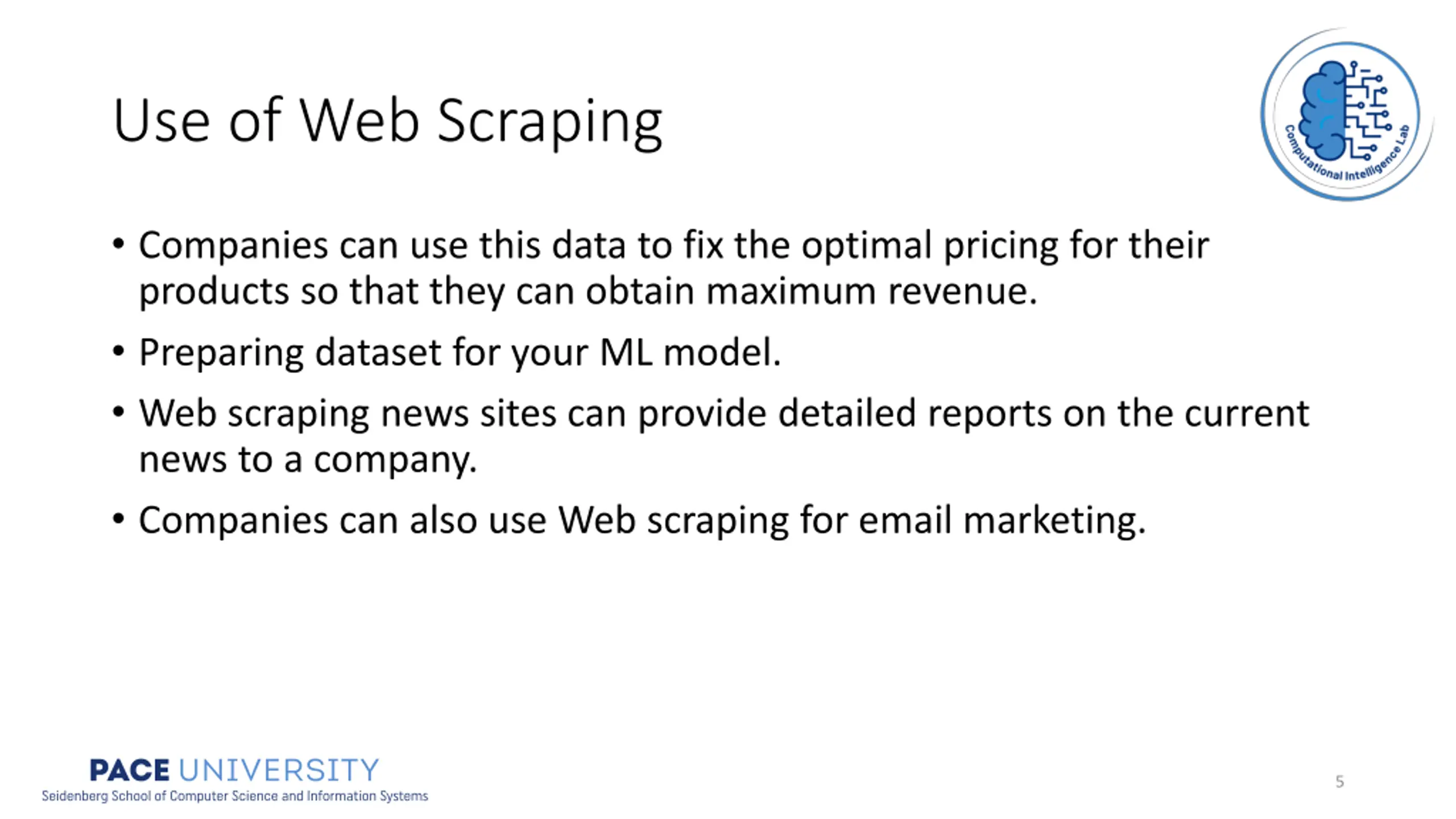 Use of Web Scraping Companies can use this data to fix the optimal pricing for their products so that they can obtain maximum revenue. Preparing dataset for your ML model. Web scraping news sites can provide detailed reports on the current news to a company. Companies can also use Web scraping for email marketing. 5