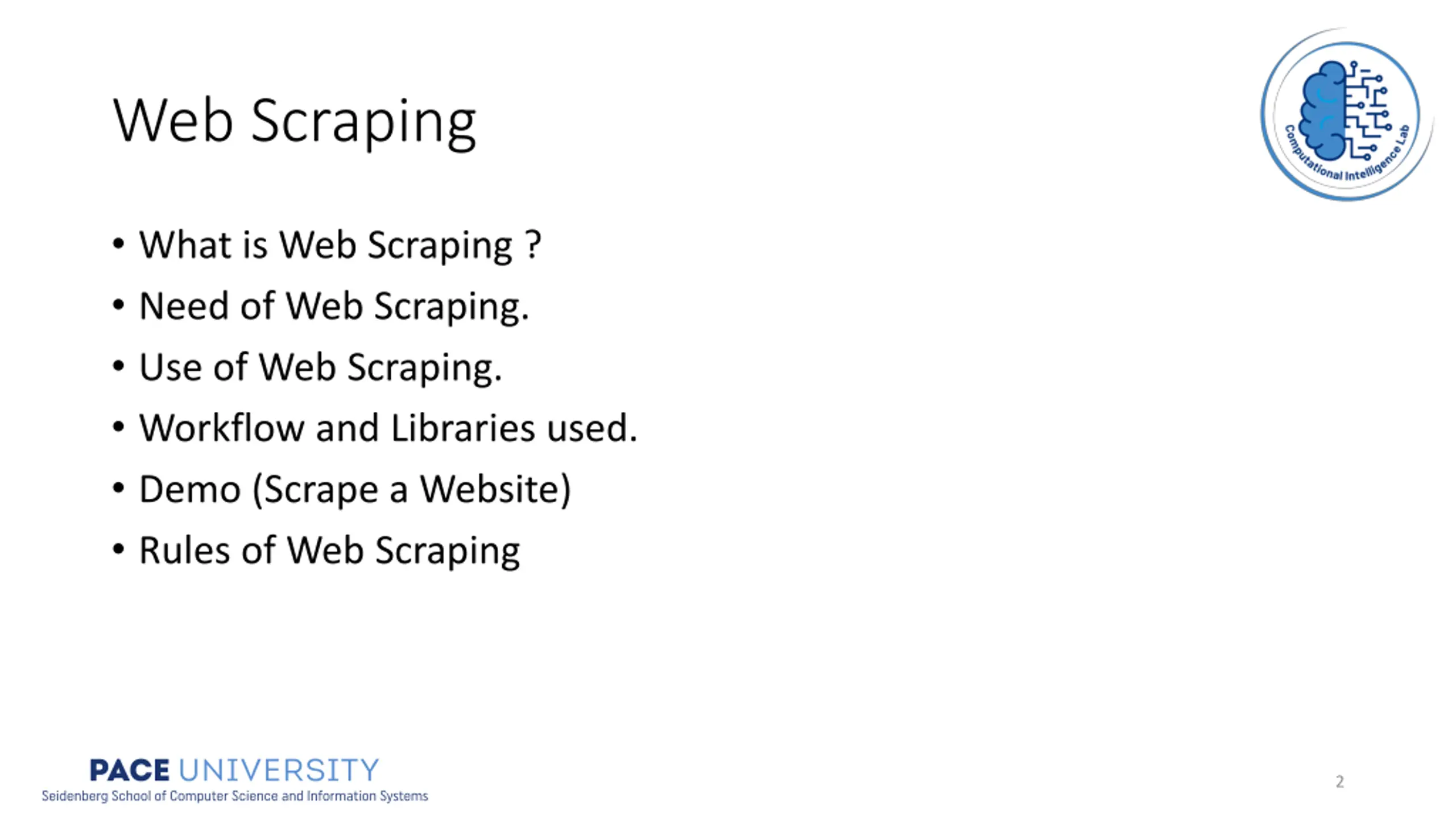 Web Scraping What is Web Scraping ? Need of Web Scraping. Use of Web Scraping. Workflow and Libraries used. Demo (Scrape a Website) Rules of Web Scraping 2