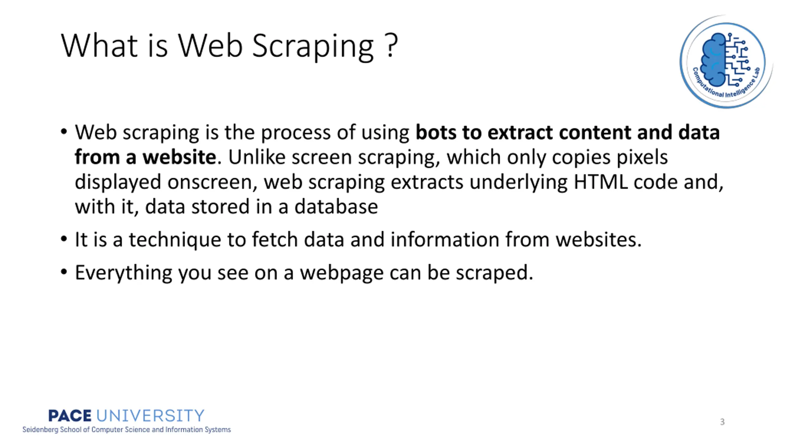 What is Web Scraping ? Web scraping is the process of using bots to extract content and data from a website. Unlike screen scraping, which only copies pixels displayed onscreen, web scraping extracts underlying HTML code and, with it, data stored in a database It is a technique to fetch data and information from websites. Everything you see on a webpage can be scraped. 3