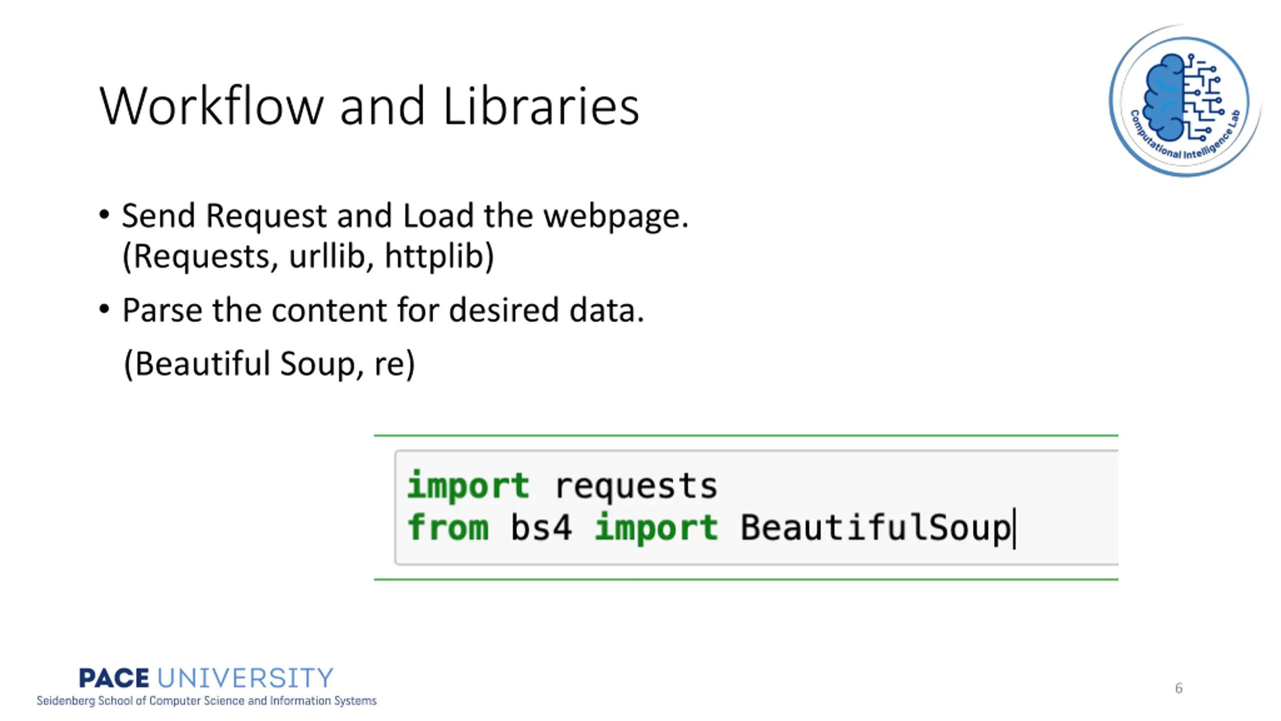 Workflow and Libraries Send Request and Load the webpage. (Requests, urllib, httplib) Parse the content for desired data. (Beautiful Soup, re) 6