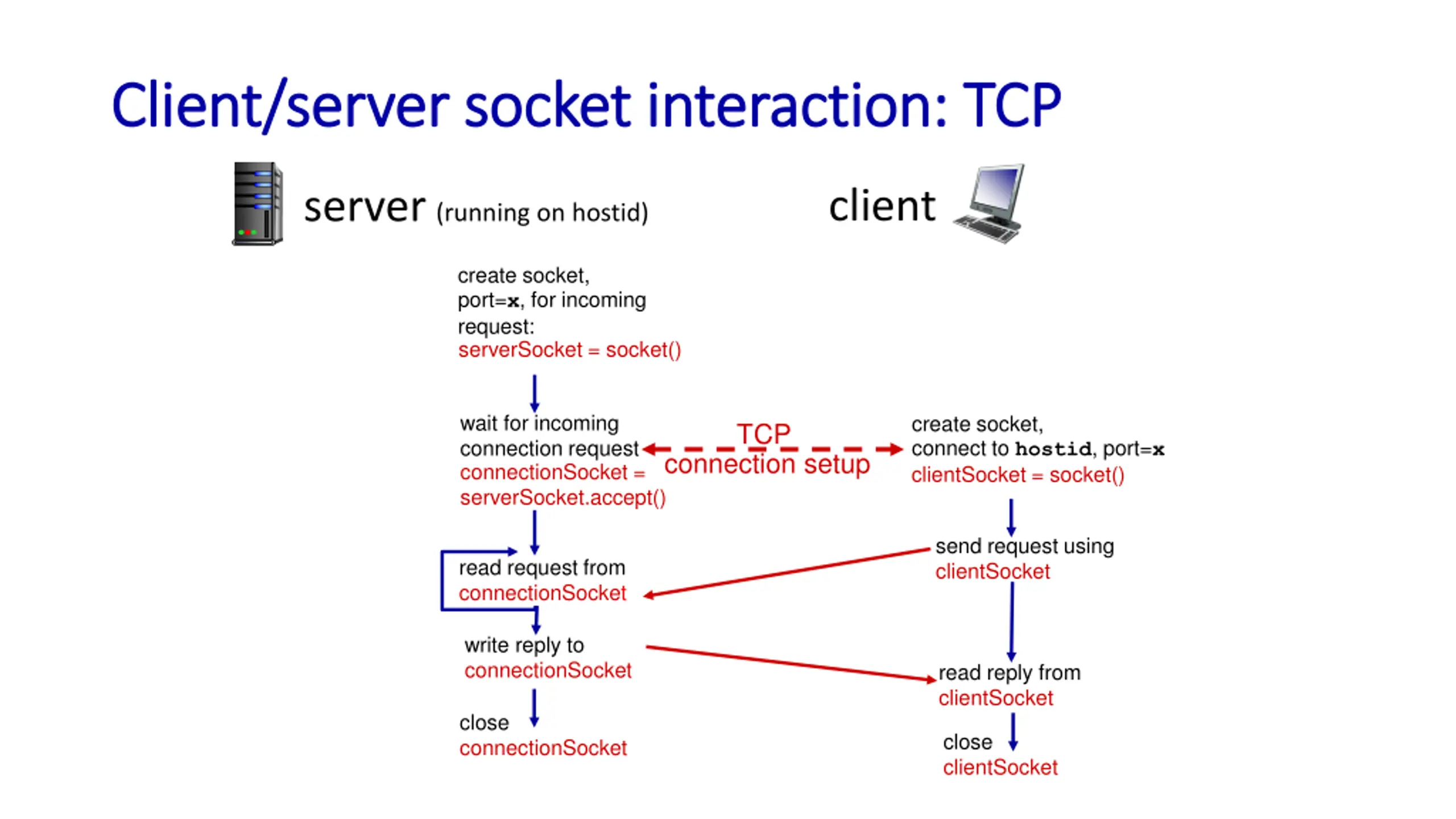 Client/server socket interaction: TCP Client/server socket interaction: TCP client server(running on hostid) create socket, port=x, for incoming request: serverSocket = socket() wait for incoming connection request connectionSocket = serverSocket.accept() create socket, connect to hostid, port=x clientSocket = socket() TCP connection setup send request using clientSocket read request from connectionSocket write reply to connectionSocket read reply from clientSocket close connectionSocket close clientSocket