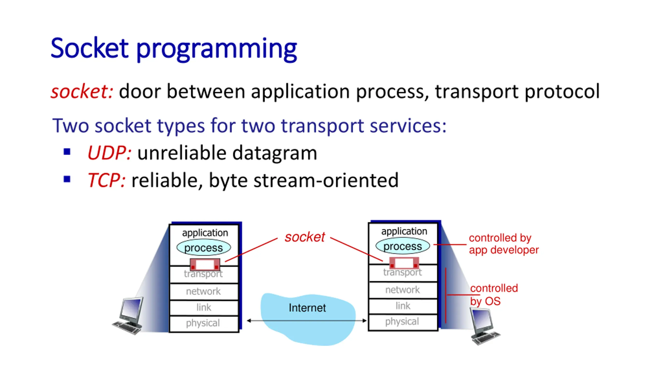 Socket programming Socket programming socket: door between application process, transport protocol Two socket types for two transport services: UDP: unreliable datagram TCP: reliable, byte stream-oriented application process application process socket controlled by app developer transport transport controlled by OS network network link Internet link physical physical