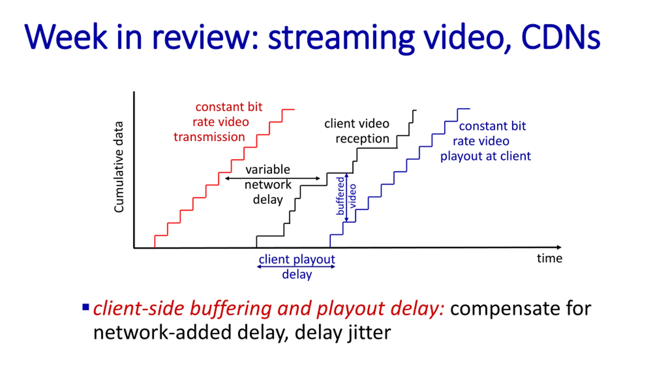 Week in review: streaming video, CDNs Week in review: streaming video, CDNs constant bit rate video transmission client video reception constant bit rate video playout at client variable network delay buffered video time client playout delay client-side buffering and playout delay: compensate for network-added delay, delay jitter