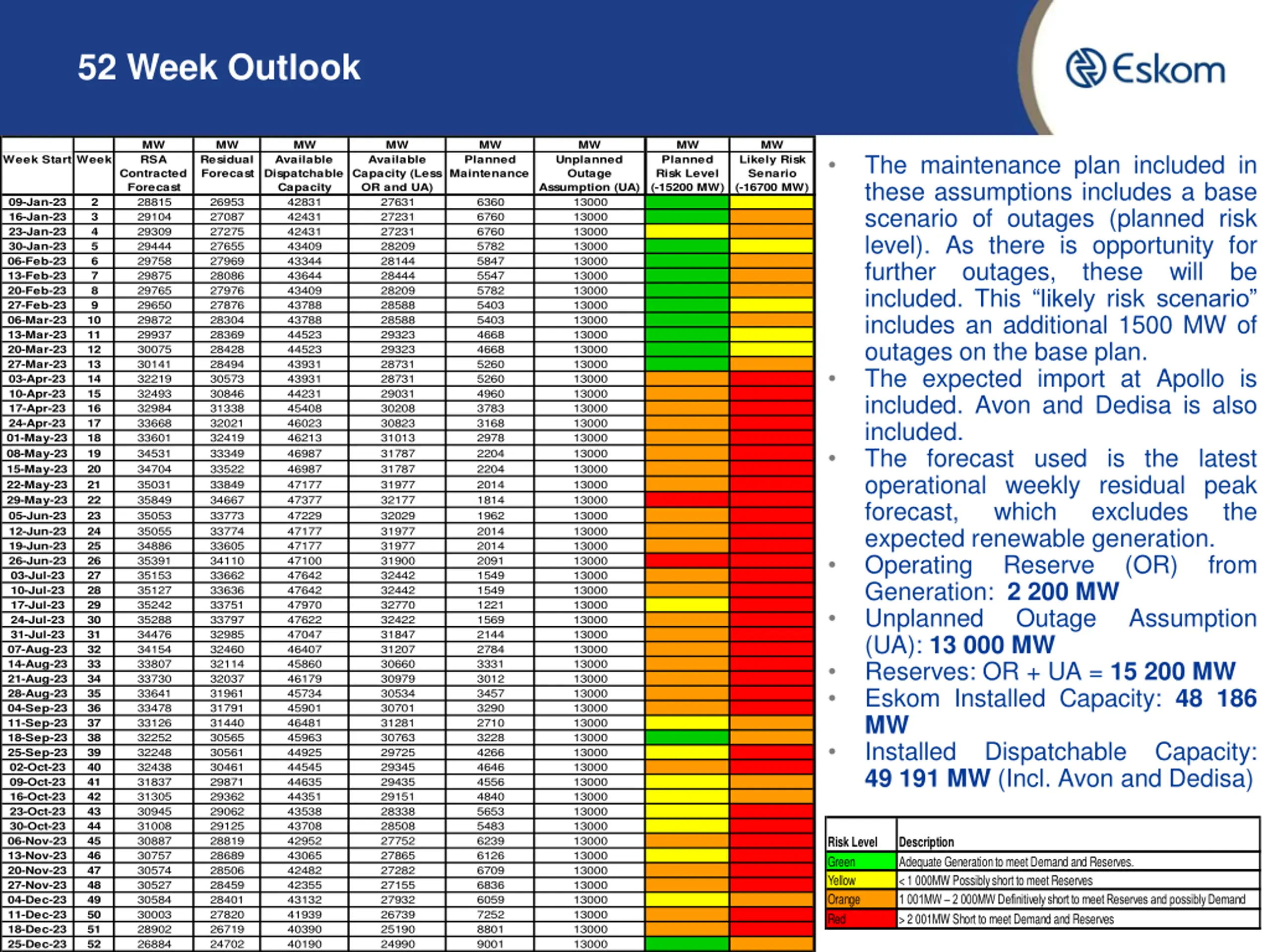 52 Week Outlook MW RSA MW MW MW MW MW MW MW The maintenance plan included in these assumptions includes a base scenario of outages (planned risk level). As there is opportunity for further outages, these will be included. This likely risk scenario includes an additional 1500 MW of outages on the base plan. The expected import at Apollo is included. Avon and Dedisa is also included. The forecast used is the latest operational weekly residual peak forecast, which expected renewable generation. Operating Reserve Generation: 2 200 MW Unplanned Outage (UA): 13 000 MW Reserves: OR + UA = 15 200 MW Eskom Installed Capacity: 48 186 MW Installed Dispatchable Capacity: 49 191 MW (Incl. Avon and Dedisa) Week Start Week Residual Forecast Available Dispatchable Capacity 42831 42431 42431 43409 43344 43644 43409 43788 43788 44523 44523 43931 43931 44231 45408 46023 46213 46987 46987 47177 47377 47229 47177 47177 47100 47642 47642 47970 47622 47047 46407 45860 46179 45734 45901 46481 45963 44925 44545 44635 44351 43538 43708 42952 43065 42482 42355 43132 41939 40390 40190 Available Capacity (Less OR and UA) 27631 27231 27231 28209 28144 28444 28209 28588 28588 29323 29323 28731 28731 29031 30208 30823 31013 31787 31787 31977 32177 32029 31977 31977 31900 32442 32442 32770 32422 31847 31207 30660 30979 30534 30701 31281 30763 29725 29345 29435 29151 28338 28508 27752 27865 27282 27155 27932 26739 25190 24990 Planned Maintenance Unplanned Outage Assumption (UA) 13000 13000 13000 13000 13000 13000 13000 13000 13000 13000 13000 13000 13000 13000 13000 13000 13000 13000 13000 13000 13000 13000 13000 13000 13000 13000 13000 13000 13000 13000 13000 13000 13000 13000 13000 13000 13000 13000 13000 13000 13000 13000 13000 13000 13000 13000 13000 13000 13000 13000 13000 Planned Risk Level (-15200 MW) 678 144 -44 554 175 358 233 712 284 954 895 237 -1842 -1815 -1130 -1198 -1406 -1562 -1735 -1872 -2490 -1744 -1797 -1628 -2210 -1220 -1194 -981 -1375 -1138 -1253 -1454 -1058 -1427 -1090 -159 198 -836 -1116 -436 -211 -724 -617 -1067 -824 -1224 -1304 -469 -1081 -1529 288 Likely Risk Senario (-16700 MW) -822 -1356 -1544 -946 -1325 -1142 -1267 -788 -1216 -546 -605 -1263 -3342 -3315 -2630 -2698 -2906 -3062 -3235 -3372 -3990 -3244 -3297 -3128 -3710 -2720 -2694 -2481 -2875 -2638 -2753 -2954 -2558 -2927 -2590 -1659 -1302 -2336 -2616 -1936 -1711 -2224 -2117 -2567 -2324 -2724 -2804 -1969 -2581 -3029 -1212 Contracted Forecast 28815 29104 29309 29444 29758 29875 29765 29650 29872 29937 30075 30141 32219 32493 32984 33668 33601 34531 34704 35031 35849 35053 35055 34886 35391 35153 35127 35242 35288 34476 34154 33807 33730 33641 33478 33126 32252 32248 32438 31837 31305 30945 31008 30887 30757 30574 30527 30584 30003 28902 26884 26953 27087 27275 27655 27969 28086 27976 27876 28304 28369 28428 28494 30573 30846 31338 32021 32419 33349 33522 33849 34667 33773 33774 33605 34110 33662 33636 33751 33797 32985 32460 32114 32037 31961 31791 31440 30565 30561 30461 29871 29362 29062 29125 28819 28689 28506 28459 28401 27820 26719 24702 6360 6760 6760 5782 5847 5547 5782 5403 5403 4668 4668 5260 5260 4960 3783 3168 2978 2204 2204 2014 1814 1962 2014 2014 2091 1549 1549 1221 1569 2144 2784 3331 3012 3457 3290 2710 3228 4266 4646 4556 4840 5653 5483 6239 6126 6709 6836 6059 7252 8801 9001 09-Jan-23 16-Jan-23 23-Jan-23 30-Jan-23 06-Feb-23 13-Feb-23 20-Feb-23 27-Feb-23 06-Mar-23 13-Mar-23 20-Mar-23 27-Mar-23 03-Apr-23 10-Apr-23 17-Apr-23 24-Apr-23 01-May-23 08-May-23 15-May-23 22-May-23 29-May-23 05-Jun-23 12-Jun-23 19-Jun-23 26-Jun-23 03-Jul-23 10-Jul-23 17-Jul-23 24-Jul-23 31-Jul-23 07-Aug-23 14-Aug-23 21-Aug-23 28-Aug-23 04-Sep-23 11-Sep-23 18-Sep-23 25-Sep-23 02-Oct-23 09-Oct-23 16-Oct-23 23-Oct-23 30-Oct-23 06-Nov-23 13-Nov-23 20-Nov-23 27-Nov-23 04-Dec-23 11-Dec-23 18-Dec-23 25-Dec-23 2 3 4 5 6 7 8 9 10 11 12 13 14 15 16 17 18 19 20 21 22 23 24 25 26 27 28 29 30 31 32 33 34 35 36 37 38 39 40 41 42 43 44 45 46 47 48 49 50 51 52 excludes the (OR) from Assumption Risk Level Green Yellow Orange Red Description Adequate Generation to meet Demand and Reserves. < 1 000MW Possibly short to meet Reserves 1 001MW 2 000MW Definitively short to meet Reserves and possibly Demand > 2 001MW Short to meet Demand and Reserves