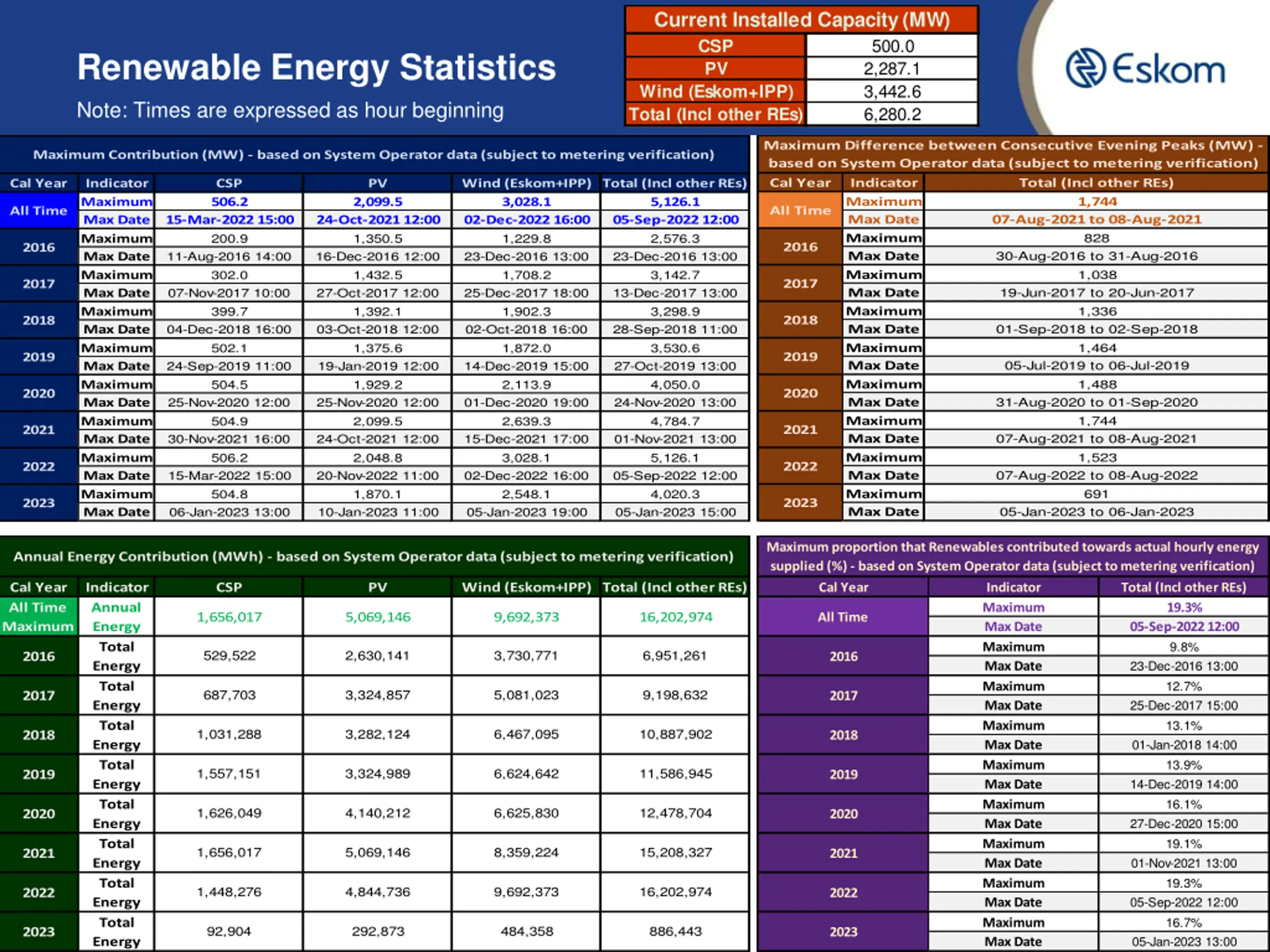 Current Installed Capacity (MW) CSP PV Wind (Eskom+IPP) Total (Incl other REs) 500.0 2,287.1 3,442.6 6,280.2 Renewable Energy Statistics Note: Times are expressed as hour beginning Maximum Difference between Consecutive Evening Peaks (MW) - based on System Operator data (subject to metering verification) Maximum Contribution (MW) - based on System Operator data (subject to metering verification) Cal Year Indicator Maximum Max Date Maximum Max Date Maximum Max Date Maximum Max Date Maximum Max Date Maximum Max Date Maximum Max Date Maximum Max Date Maximum Max Date Total (Incl other REs) 1,744 07-Aug-2021 to 08-Aug-2021 828 30-Aug-2016 to 31-Aug-2016 1,038 19-Jun-2017 to 20-Jun-2017 1,336 01-Sep-2018 to 02-Sep-2018 1,464 05-Jul-2019 to 06-Jul-2019 1,488 31-Aug-2020 to 01-Sep-2020 1,744 07-Aug-2021 to 08-Aug-2021 1,523 07-Aug-2022 to 08-Aug-2022 691 05-Jan-2023 to 06-Jan-2023 Cal Year Indicator Maximum Max Date Maximum Max Date Maximum Max Date Maximum Max Date Maximum Max Date Maximum Max Date Maximum Max Date Maximum Max Date Maximum Max Date CSP 506.2 PV Wind (Eskom+IPP) Total (Incl other REs) 3,028.1 02-Dec-2022 16:00 1,229.8 23-Dec-2016 13:00 1,708.2 25-Dec-2017 18:00 1,902.3 02-Oct-2018 16:00 1,872.0 14-Dec-2019 15:00 2,113.9 01-Dec-2020 19:00 2,639.3 15-Dec-2021 17:00 3,028.1 02-Dec-2022 16:00 2,548.1 05-Jan-2023 19:00 2,099.5 5,126.1 All Time All Time 15-Mar-2022 15:00 200.9 11-Aug-2016 14:00 302.0 07-Nov-2017 10:00 399.7 04-Dec-2018 16:00 502.1 24-Sep-2019 11:00 504.5 25-Nov-2020 12:00 504.9 30-Nov-2021 16:00 506.2 15-Mar-2022 15:00 504.8 06-Jan-2023 13:00 24-Oct-2021 12:00 1,350.5 16-Dec-2016 12:00 1,432.5 27-Oct-2017 12:00 1,392.1 03-Oct-2018 12:00 1,375.6 19-Jan-2019 12:00 1,929.2 25-Nov-2020 12:00 2,099.5 24-Oct-2021 12:00 2,048.8 20-Nov-2022 11:00 1,870.1 10-Jan-2023 11:00 05-Sep-2022 12:00 2,576.3 23-Dec-2016 13:00 3,142.7 13-Dec-2017 13:00 3,298.9 28-Sep-2018 11:00 3,530.6 27-Oct-2019 13:00 4,050.0 24-Nov-2020 13:00 4,784.7 01-Nov-2021 13:00 5,126.1 05-Sep-2022 12:00 4,020.3 05-Jan-2023 15:00 2016 2016 2017 2017 2018 2018 2019 2019 2020 2020 2021 2021 2022 2022 2023 2023 Maximum proportion that Renewables contributed towards actual hourly energy supplied (%) - based on System Operator data (subject to metering verification) Annual Energy Contribution (MWh) - based on System Operator data (subject to metering verification) Cal Year All Time Maximum Indicator Annual Energy Total Energy Total Energy Total Energy Total Energy Total Energy Total Energy Total Energy Total Energy CSP PV Wind (Eskom+IPP) Total (Incl other REs) Cal Year Indicator Maximum Max Date Maximum Max Date Maximum Max Date Maximum Max Date Maximum Max Date Maximum Max Date Maximum Max Date Maximum Max Date Maximum Max Date Total (Incl other REs) 19.3% 05-Sep-2022 12:00 9.8% 23-Dec-2016 13:00 12.7% 25-Dec-2017 15:00 13.1% 01-Jan-2018 14:00 13.9% 14-Dec-2019 14:00 16.1% 27-Dec-2020 15:00 19.1% 01-Nov-2021 13:00 19.3% 05-Sep-2022 12:00 16.7% 05-Jan-2023 13:00 1,656,017 5,069,146 9,692,373 16,202,974 All Time 529,522 2,630,141 3,730,771 6,951,261 2016 2016 687,703 3,324,857 5,081,023 9,198,632 2017 2017 1,031,288 3,282,124 6,467,095 10,887,902 2018 2018 1,557,151 3,324,989 6,624,642 11,586,945 2019 2019 1,626,049 4,140,212 6,625,830 12,478,704 2020 2020 1,656,017 5,069,146 8,359,224 15,208,327 2021 2021 1,448,276 4,844,736 9,692,373 16,202,974 2022 2022 92,904 292,873 484,358 886,443 2023 2023