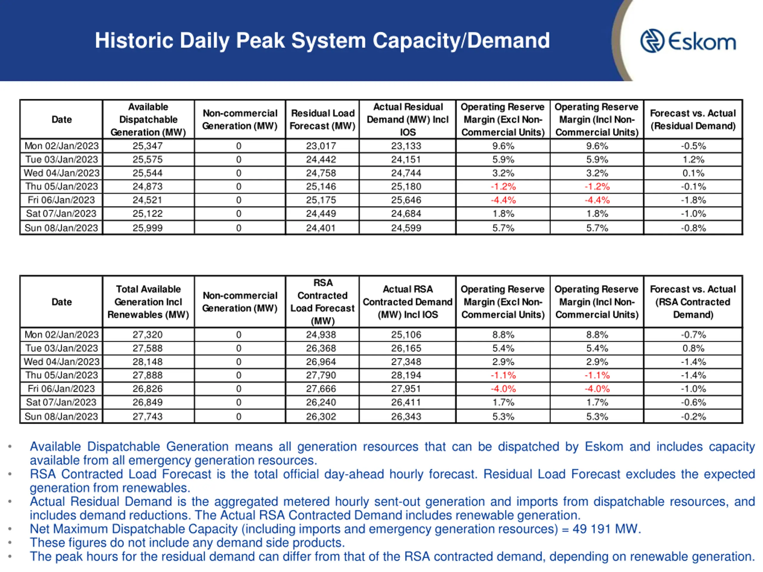 Historic Daily Peak System Capacity/Demand Available Dispatchable Generation (MW) 25,347 25,575 25,544 24,873 24,521 25,122 25,999 Actual Residual Demand (MW) Incl IOS 23,133 24,151 24,744 25,180 25,646 24,684 24,599 Operating Reserve Margin (Excl Non- Commercial Units) 9.6% 5.9% 3.2% -1.2% -4.4% 1.8% 5.7% Operating Reserve Margin (Incl Non- Commercial Units) 9.6% 5.9% 3.2% -1.2% -4.4% 1.8% 5.7% Non-commercial Generation (MW) Residual Load Forecast (MW) Forecast vs. Actual (Residual Demand) Date Mon 02/Jan/2023 Tue 03/Jan/2023 Wed 04/Jan/2023 Thu 05/Jan/2023 Fri 06/Jan/2023 Sat 07/Jan/2023 Sun 08/Jan/2023 0 0 0 0 0 0 0 23,017 24,442 24,758 25,146 25,175 24,449 24,401 -0.5% 1.2% 0.1% -0.1% -1.8% -1.0% -0.8% RSA Total Available Generation Incl Renewables (MW) Actual RSA Contracted Demand (MW) Incl IOS Operating Reserve Margin (Excl Non- Commercial Units) Operating Reserve Margin (Incl Non- Commercial Units) Forecast vs. Actual (RSA Contracted Demand) Non-commercial Generation (MW) Contracted Load Forecast (MW) 24,938 26,368 26,964 27,790 27,666 26,240 26,302 Date Mon 02/Jan/2023 Tue 03/Jan/2023 Wed 04/Jan/2023 Thu 05/Jan/2023 Fri 06/Jan/2023 Sat 07/Jan/2023 Sun 08/Jan/2023 27,320 27,588 28,148 27,888 26,826 26,849 27,743 0 0 0 0 0 0 0 25,106 26,165 27,348 28,194 27,951 26,411 26,343 8.8% 5.4% 2.9% -1.1% -4.0% 1.7% 5.3% 8.8% 5.4% 2.9% -1.1% -4.0% 1.7% 5.3% -0.7% 0.8% -1.4% -1.4% -1.0% -0.6% -0.2% Available Dispatchable Generation means all generation resources that can be dispatched by Eskom and includes capacity available from all emergency generation resources. RSA Contracted Load Forecast is the total official day-ahead hourly forecast. Residual Load Forecast excludes the expected generation from renewables. Actual Residual Demand is the aggregated metered hourly sent-out generation and imports from dispatchable resources, and includes demand reductions. The Actual RSA Contracted Demand includes renewable generation. Net Maximum Dispatchable Capacity (including imports and emergency generation resources) = 49 191 MW. These figures do not include any demand side products. The peak hours for the residual demand can differ from that of the RSA contracted demand, depending on renewable generation.