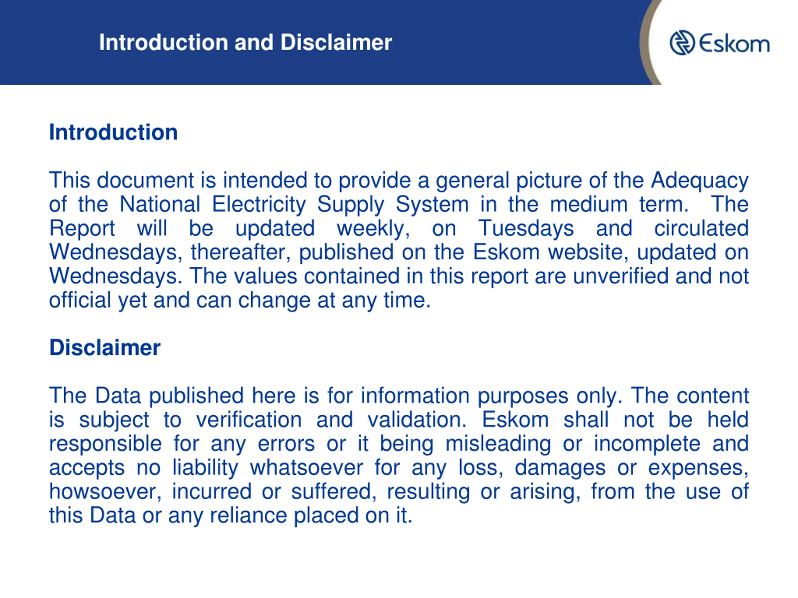Introduction and Disclaimer Introduction This document is intended to provide a general picture of the Adequacy of the National Electricity Supply System in the medium term. The Report will be updated weekly, on Tuesdays and circulated Wednesdays, thereafter, published on the Eskom website, updated on Wednesdays. The values contained in this report are unverified and not official yet and can change at any time. Disclaimer The Data published here is for information purposes only. The content is subject to verification and validation. Eskom shall not be held responsible for any errors or it being misleading or incomplete and accepts no liability whatsoever for any loss, damages or expenses, howsoever, incurred or suffered, resulting or arising, from the use of this Data or any reliance placed on it.