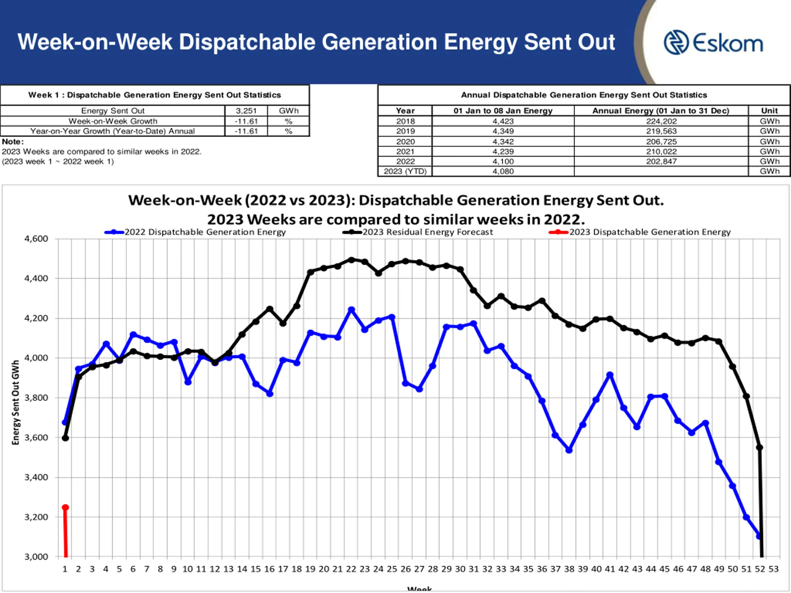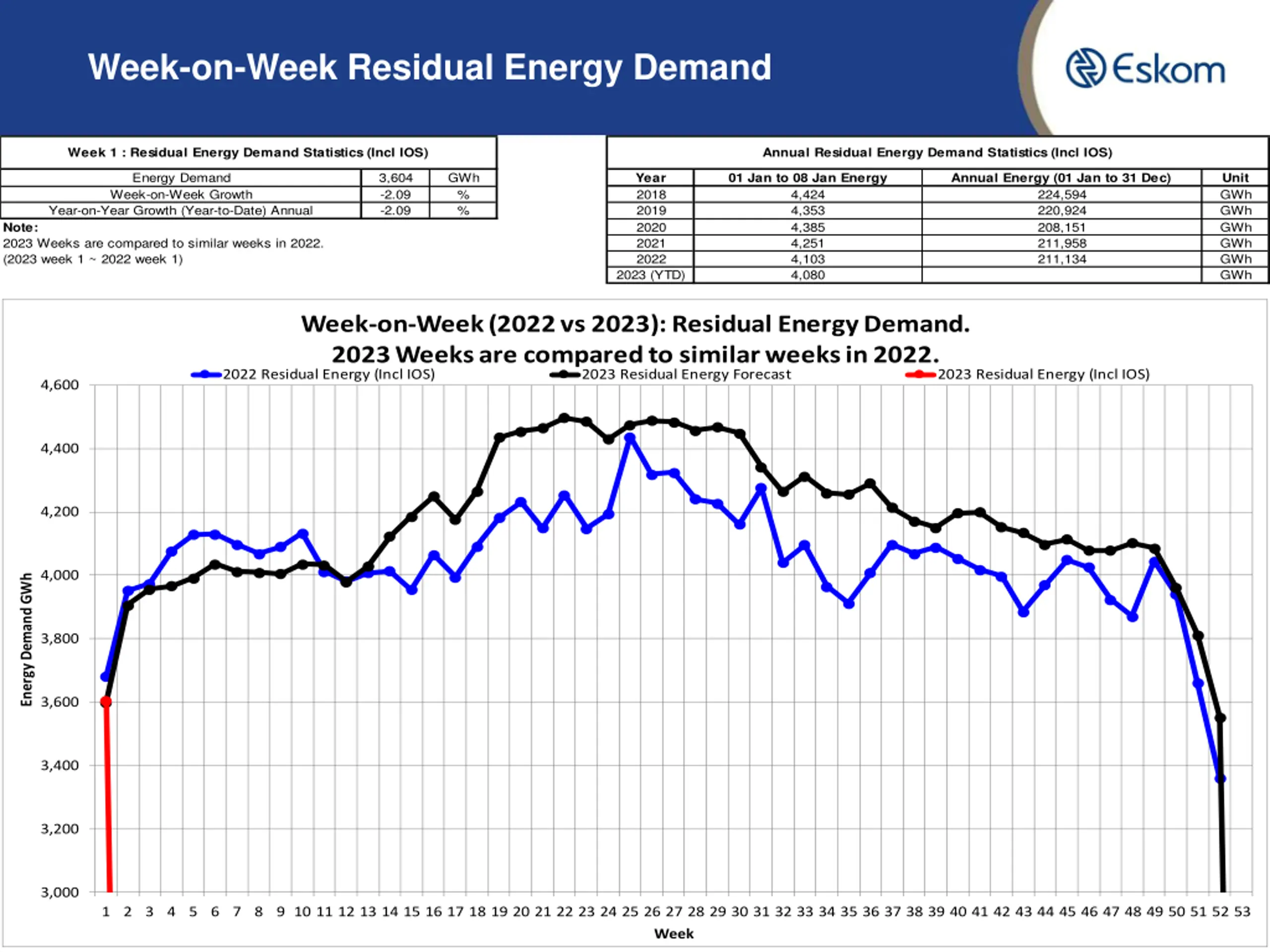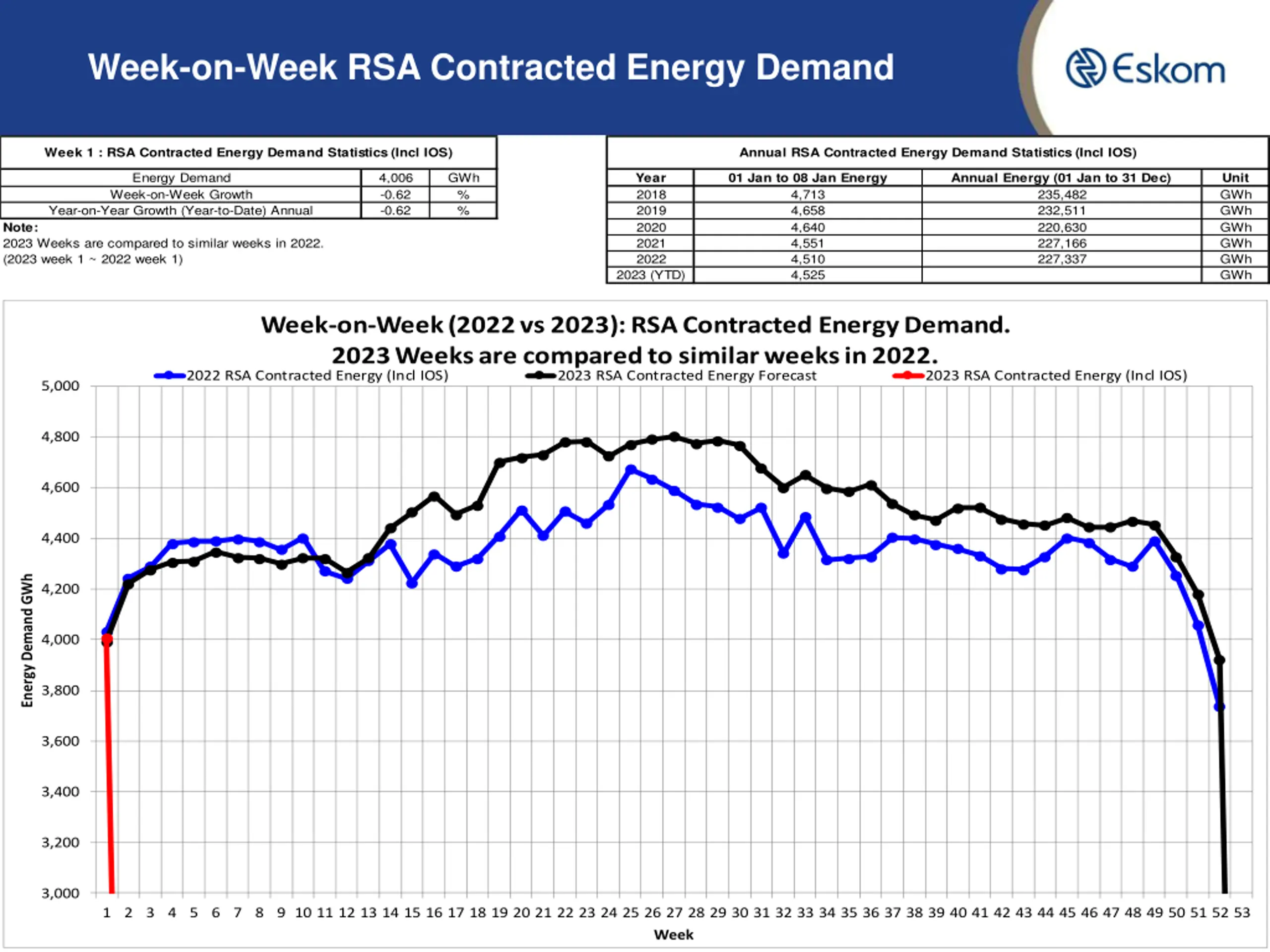 Week-on-Week RSA Contracted Energy Demand Week 1 : RSA Contracted Energy Demand Statistics (Incl IOS) Annual RSA Contracted Energy Demand Statistics (Incl IOS) Energy Demand Week-on-Week Growth Year-on-Year Growth (Year-to-Date) Annual 4,006 -0.62 -0.62 GWh % % Year 2018 2019 2020 2021 2022 01 Jan to 08 Jan Energy 4,713 4,658 4,640 4,551 4,510 4,525 Annual Energy (01 Jan to 31 Dec) 235,482 232,511 220,630 227,166 227,337 Unit GWh GWh GWh GWh GWh GWh Note: 2023 Weeks are compared to similar weeks in 2022. (2023 week 1 ~ 2022 week 1) 2023 (YTD) Week-on-Week (2022 vs 2023): RSA Contracted Energy Demand. 2023 Weeks are compared to similar weeks in 2022. 2022 RSA Contracted Energy (Incl IOS) 2023 RSA Contracted Energy Forecast 2023 RSA Contracted Energy (Incl IOS) 5,000 4,800 4,600 4,400 Energy Demand GWh 4,200 4,000 3,800 3,600 3,400 3,200 3,000 6 1 2 3 4 5 6 7 8 9 10 11 12 13 14 15 16 17 18 19 20 21 22 23 24 25 26 27 28 29 30 31 32 33 34 35 36 37 38 39 40 41 42 43 44 45 46 47 48 49 50 51 52 53 Week