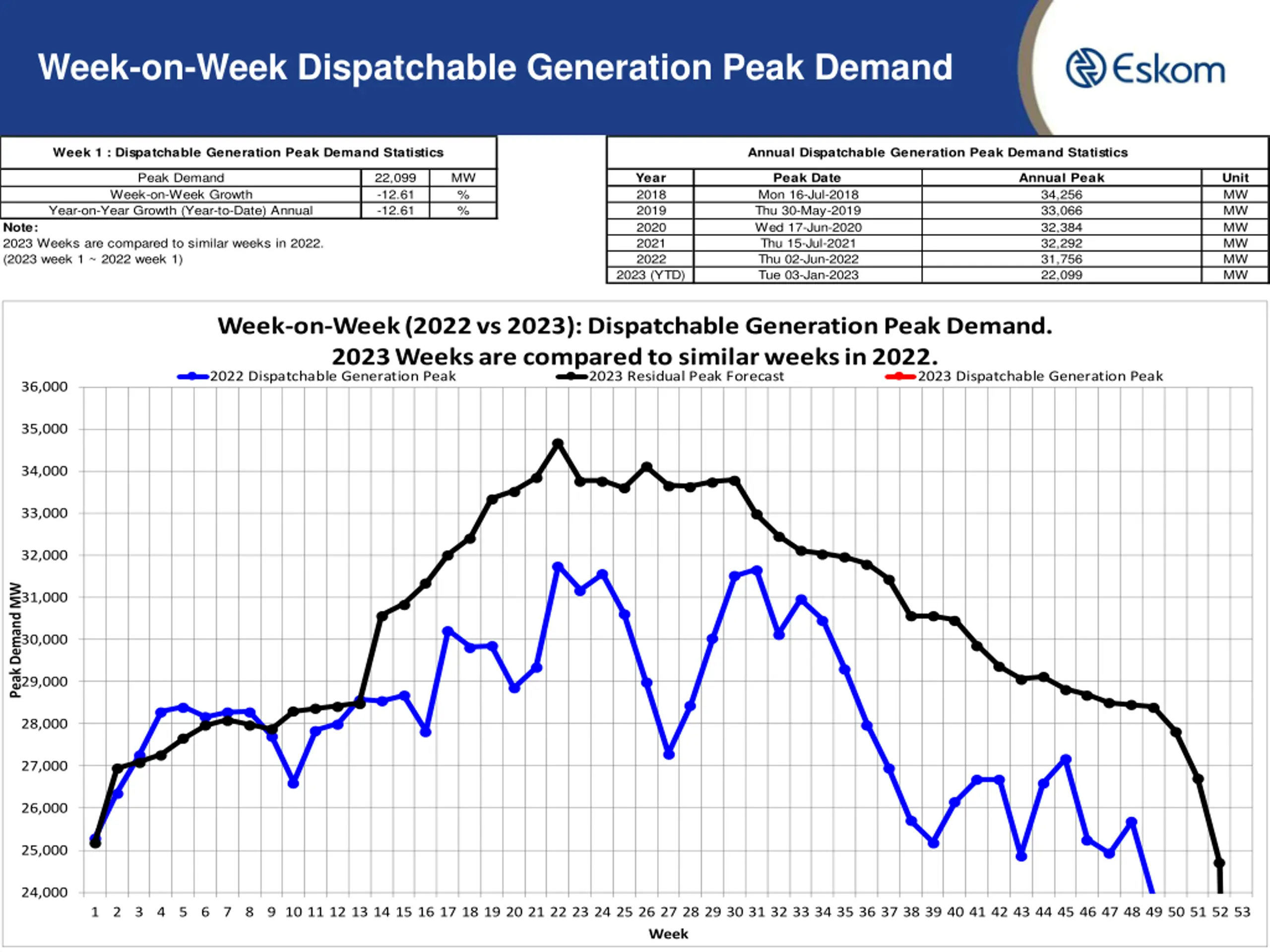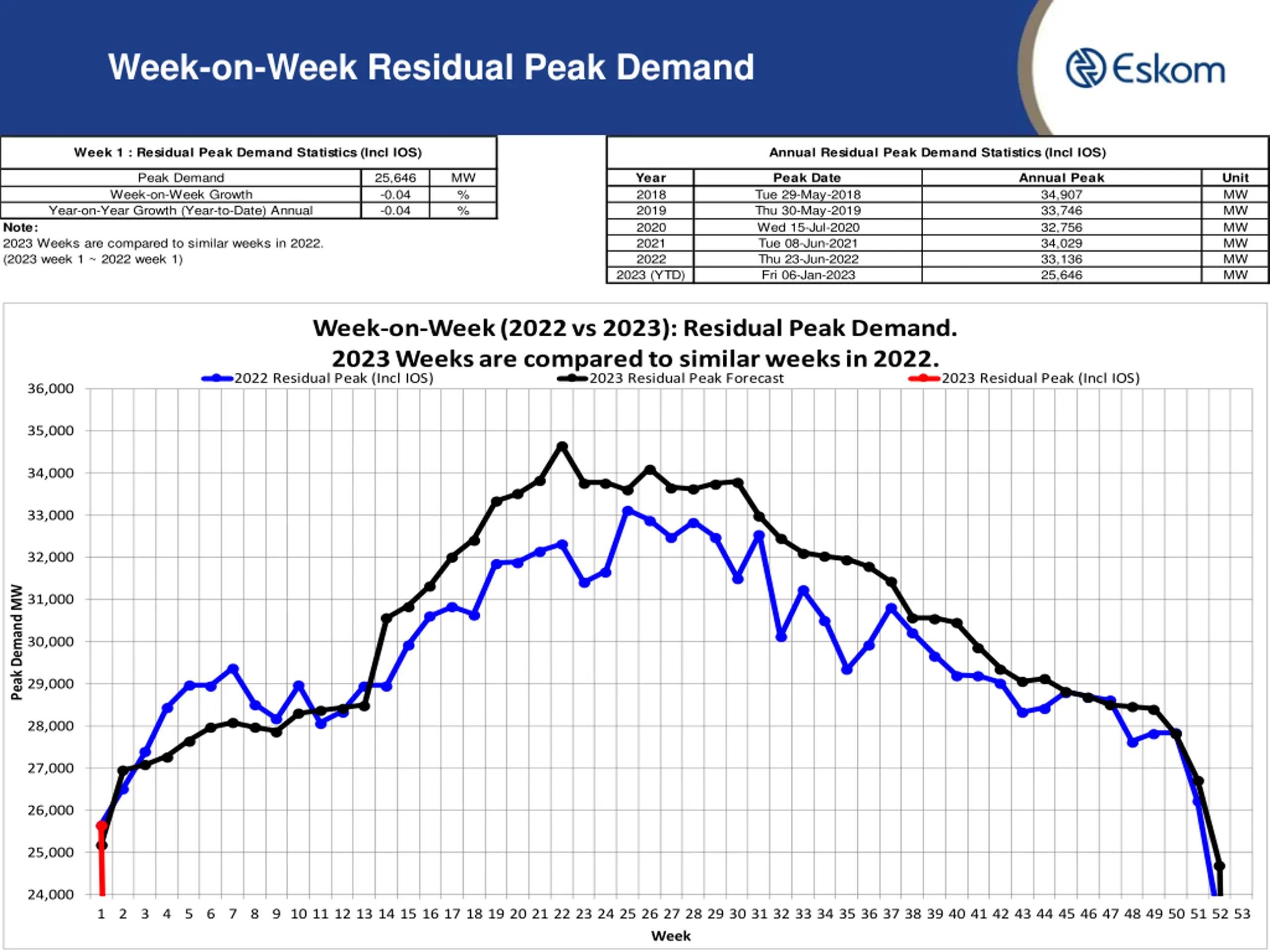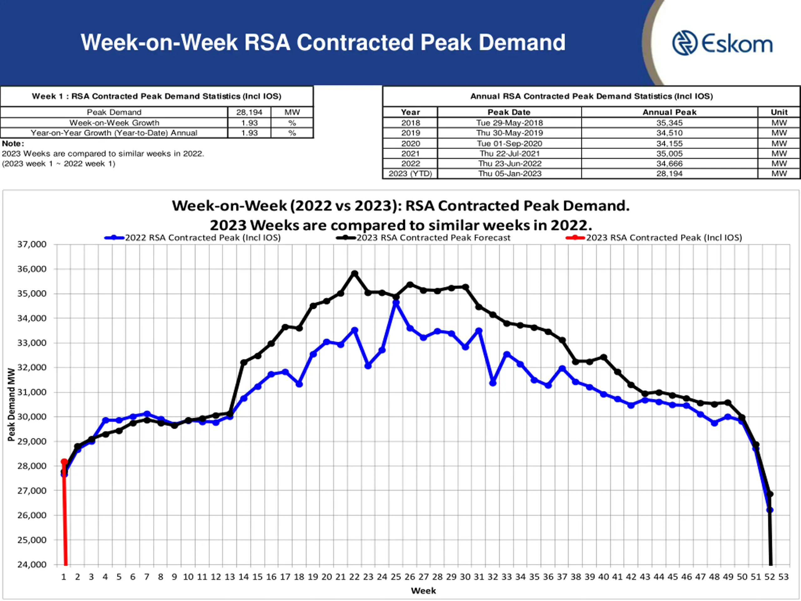 Week-on-Week RSA Contracted Peak Demand Week 1 : RSA Contracted Peak Demand Statistics (Incl IOS) Annual RSA Contracted Peak Demand Statistics (Incl IOS) Peak Demand Week-on-Week Growth Year-on-Year Growth (Year-to-Date) Annual 28,194 1.93 1.93 MW % % Year 2018 2019 2020 2021 2022 Peak Date Tue 29-May-2018 Thu 30-May-2019 Tue 01-Sep-2020 Thu 22-Jul-2021 Thu 23-Jun-2022 Thu 05-Jan-2023 Annual Peak 35,345 34,510 34,155 35,005 34,666 28,194 Unit MW MW MW MW MW MW Note: 2023 Weeks are compared to similar weeks in 2022. (2023 week 1 ~ 2022 week 1) 2023 (YTD) Week-on-Week (2022 vs 2023): RSA Contracted Peak Demand. 2023 Weeks are compared to similar weeks in 2022. 2022 RSA Contracted Peak (Incl IOS) 2023 RSA Contracted Peak Forecast 2023 RSA Contracted Peak (Incl IOS) 37,000 36,000 35,000 34,000 33,000 32,000 Peak Demand MW 31,000 30,000 29,000 28,000 27,000 26,000 25,000 24,000 9 1 2 3 4 5 6 7 8 9 10 11 12 13 14 15 16 17 18 19 20 21 22 23 24 25 26 27 28 29 30 31 32 33 34 35 36 37 38 39 40 41 42 43 44 45 46 47 48 49 50 51 52 53 Week
