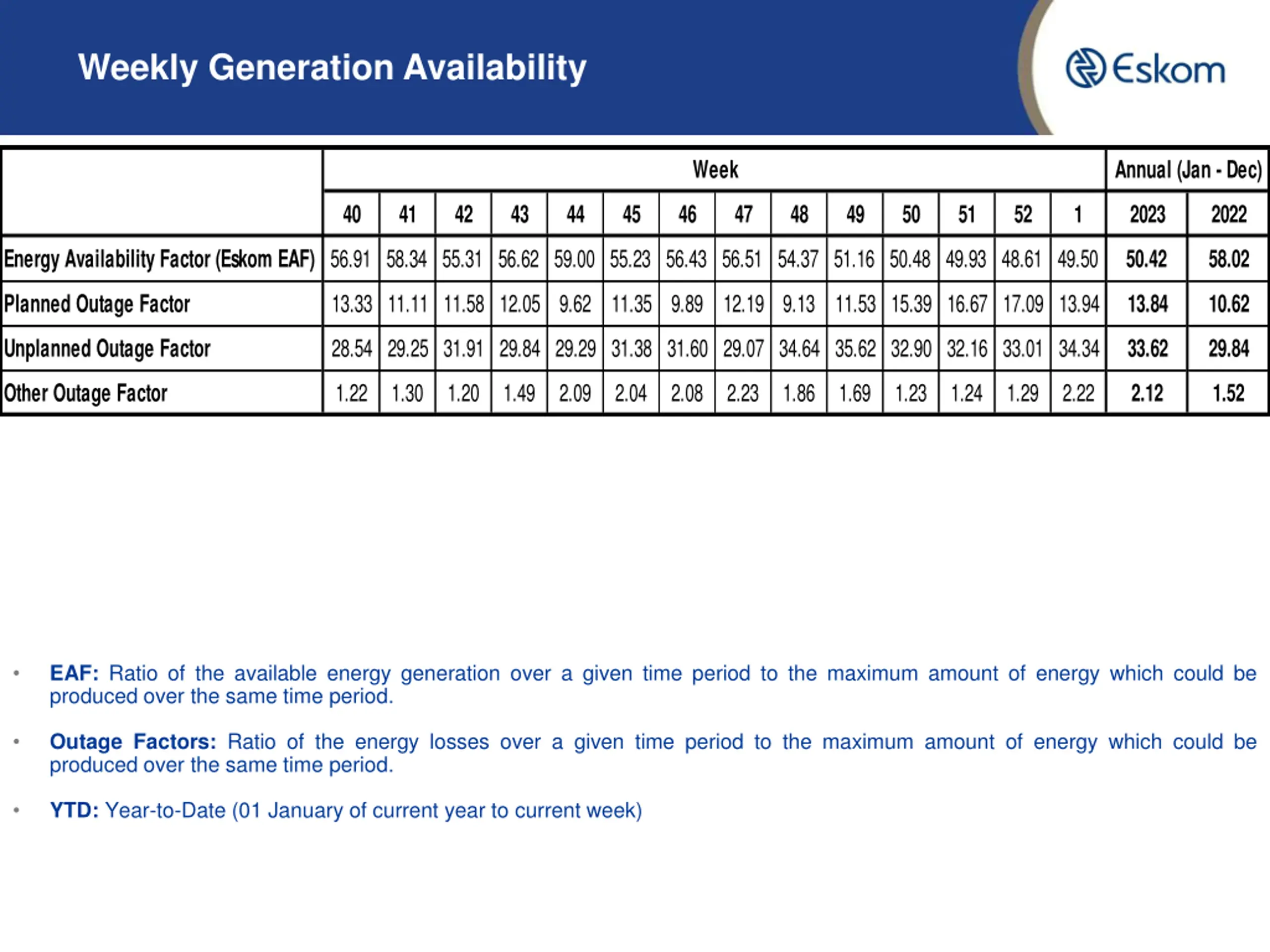 Weekly Generation Availability Week Annual (Jan - Dec) 40 41 42 43 44 45 46 47 48 49 50 51 52 1 2023 2022 Energy Availability Factor (Eskom EAF) 56.91 58.34 55.31 56.62 59.00 55.23 56.43 56.51 54.37 51.16 50.48 49.93 48.61 49.50 50.42 58.02 13.33 11.11 11.58 12.05 9.62 11.35 9.89 12.19 9.13 11.53 15.39 16.67 17.09 13.94 Planned Outage Factor 13.84 10.62 28.54 29.25 31.91 29.84 29.29 31.38 31.60 29.07 34.64 35.62 32.90 32.16 33.01 34.34 Unplanned Outage Factor 33.62 29.84 1.22 1.30 1.20 1.49 2.09 2.04 2.08 2.23 1.86 1.69 1.23 1.24 1.29 2.22 Other Outage Factor 2.12 1.52 EAF: Ratio of the available energy generation over a given time period to the maximum amount of energy which could be produced over the same time period. Outage Factors: Ratio of the energy losses over a given time period to the maximum amount of energy which could be produced over the same time period. YTD: Year-to-Date (01 January of current year to current week)