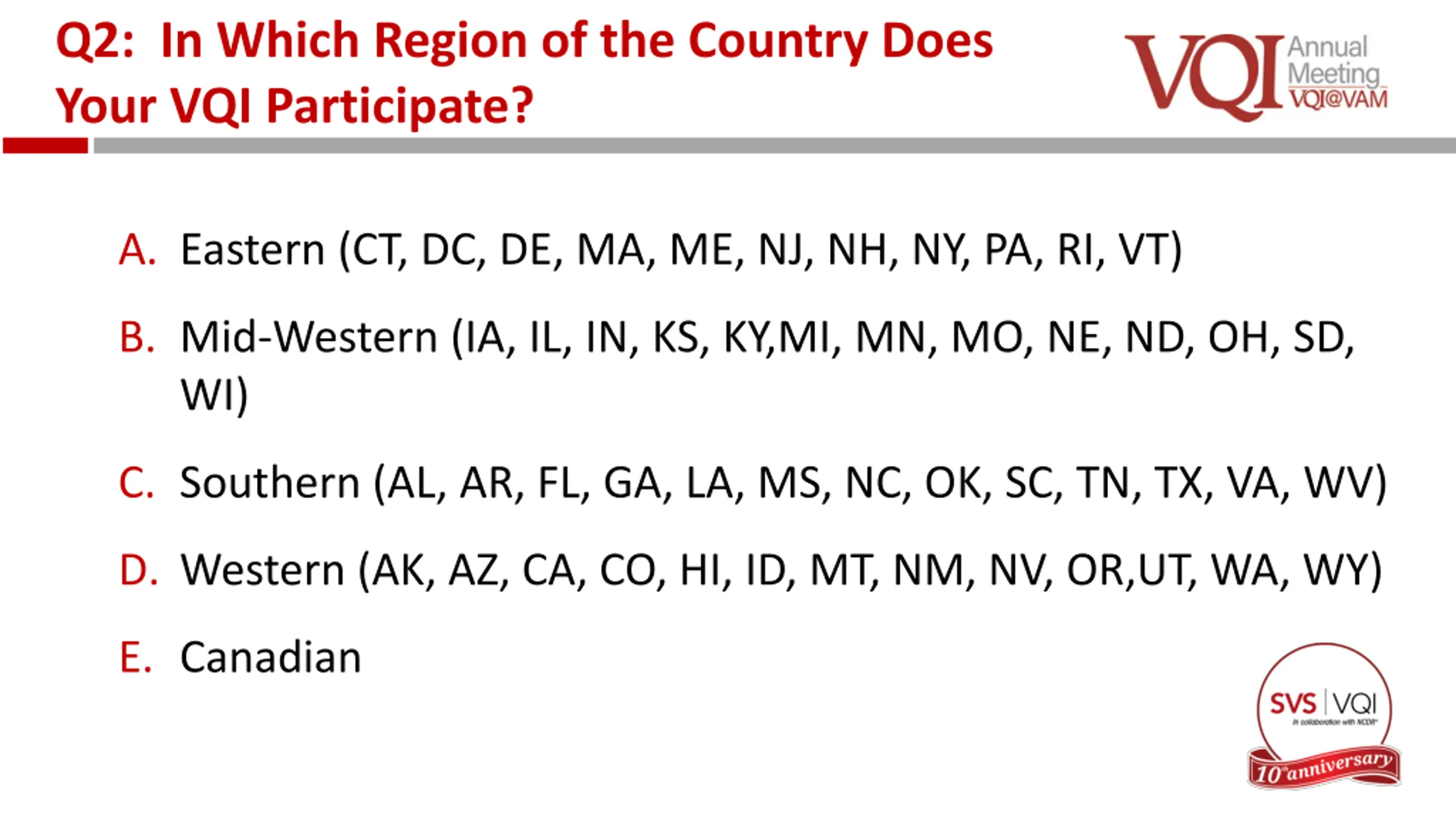 Q2: In Which Region of the Country Does Your VQI Participate? A. Eastern (CT, DC, DE, MA, ME, NJ, NH, NY, PA, RI, VT) B. Mid-Western (IA, IL, IN, KS, KY,MI, MN, MO, NE, ND, OH, SD, WI) C. Southern (AL, AR, FL, GA, LA, MS, NC, OK, SC, TN, TX, VA, WV) D. Western (AK, AZ, CA, CO, HI, ID, MT, NM, NV, OR,UT, WA, WY) E. Canadian