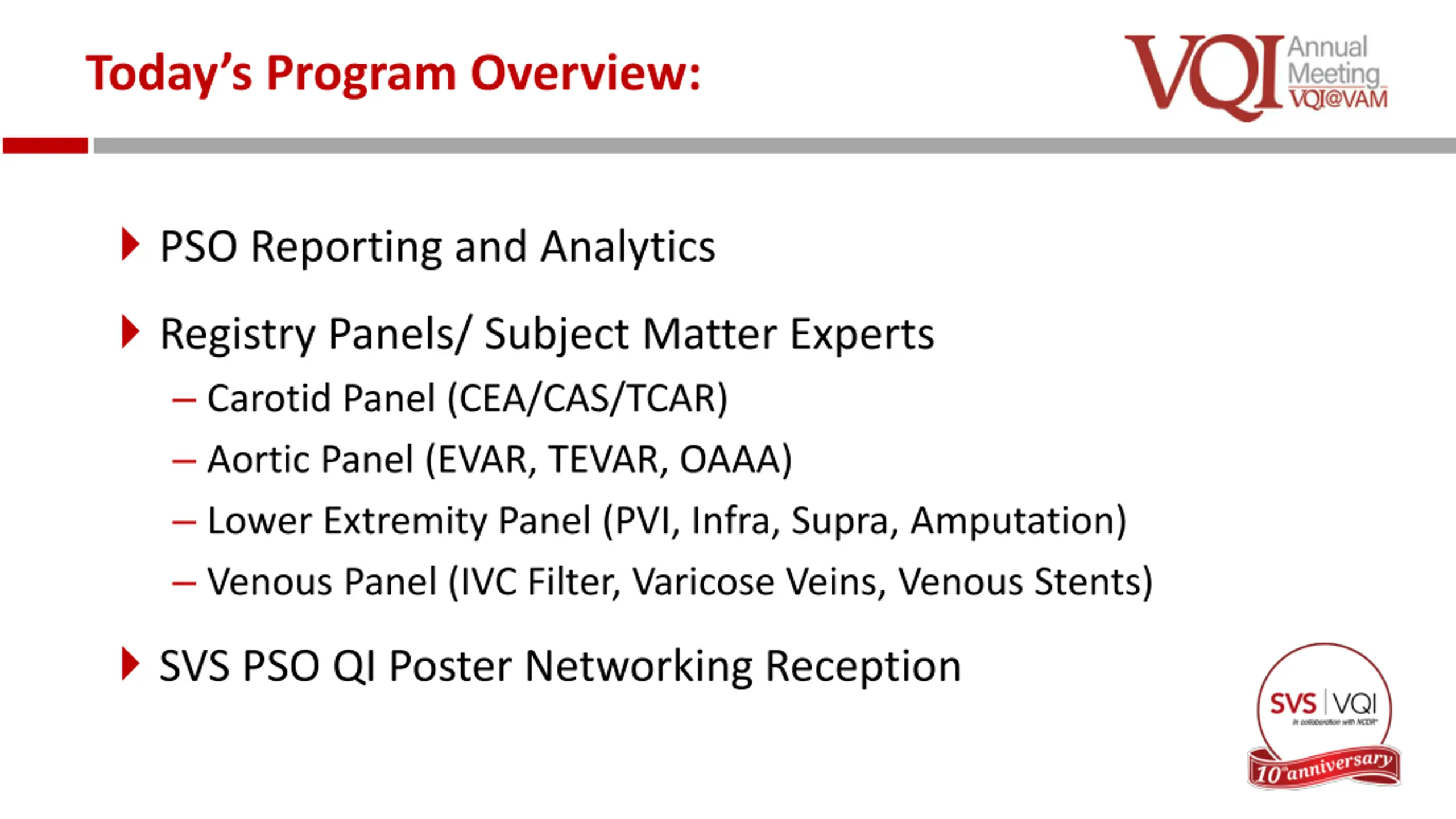 Todays Program Overview: PSO Reporting and Analytics Registry Panels/ Subject Matter Experts Carotid Panel (CEA/CAS/TCAR) Aortic Panel (EVAR, TEVAR, OAAA) Lower Extremity Panel (PVI, Infra, Supra, Amputation) Venous Panel (IVC Filter, Varicose Veins, Venous Stents) SVS PSO QI Poster Networking Reception