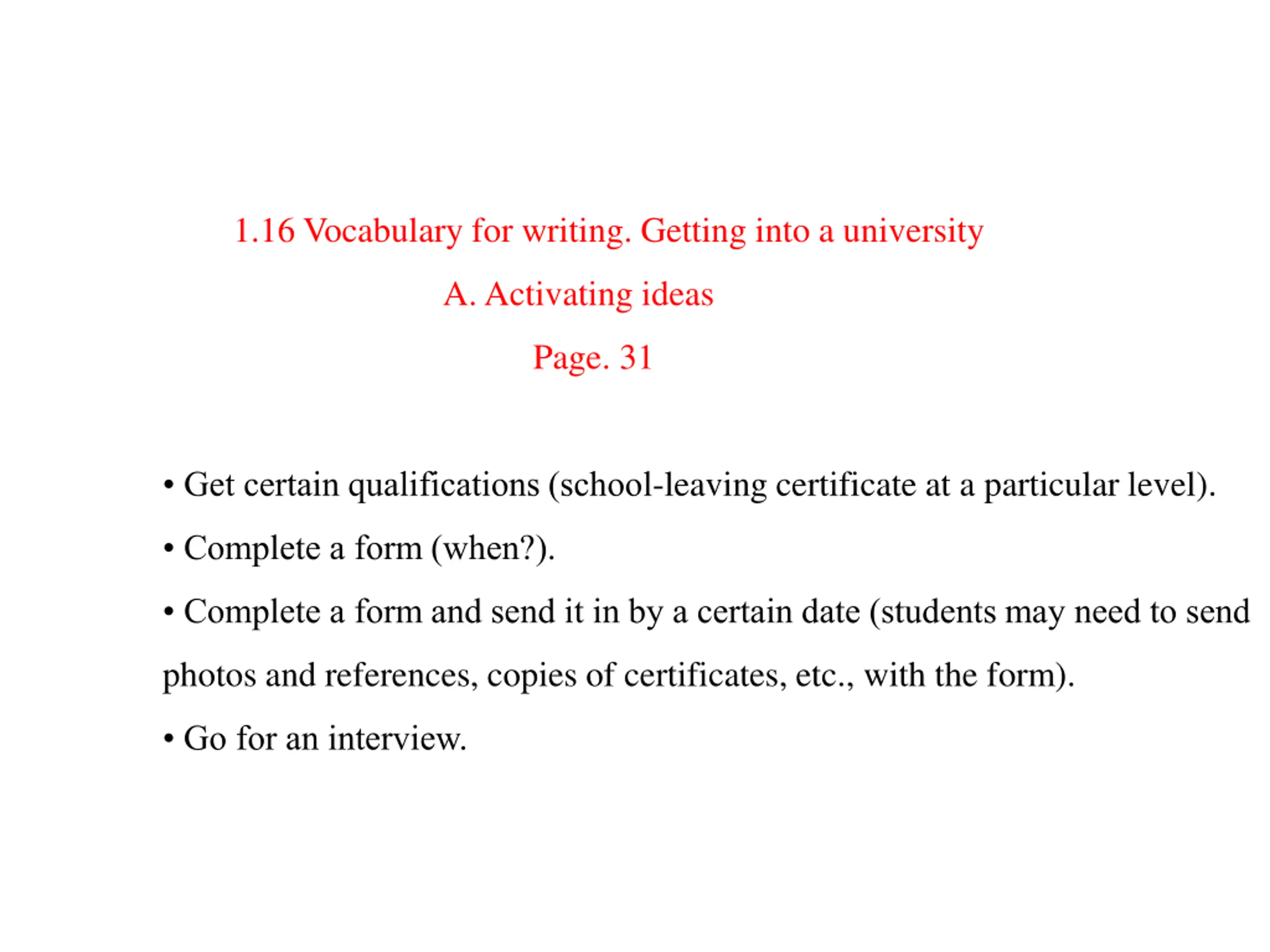 1.16 Vocabulary for writing. Getting into a university A. Activating ideas Page. 31 Get certain qualifications (school-leaving certificate at a particular level). Complete a form (when?). Complete a form and send it in by a certain date (students may need to send photos and references, copies of certificates, etc., with the form). Go for an interview.